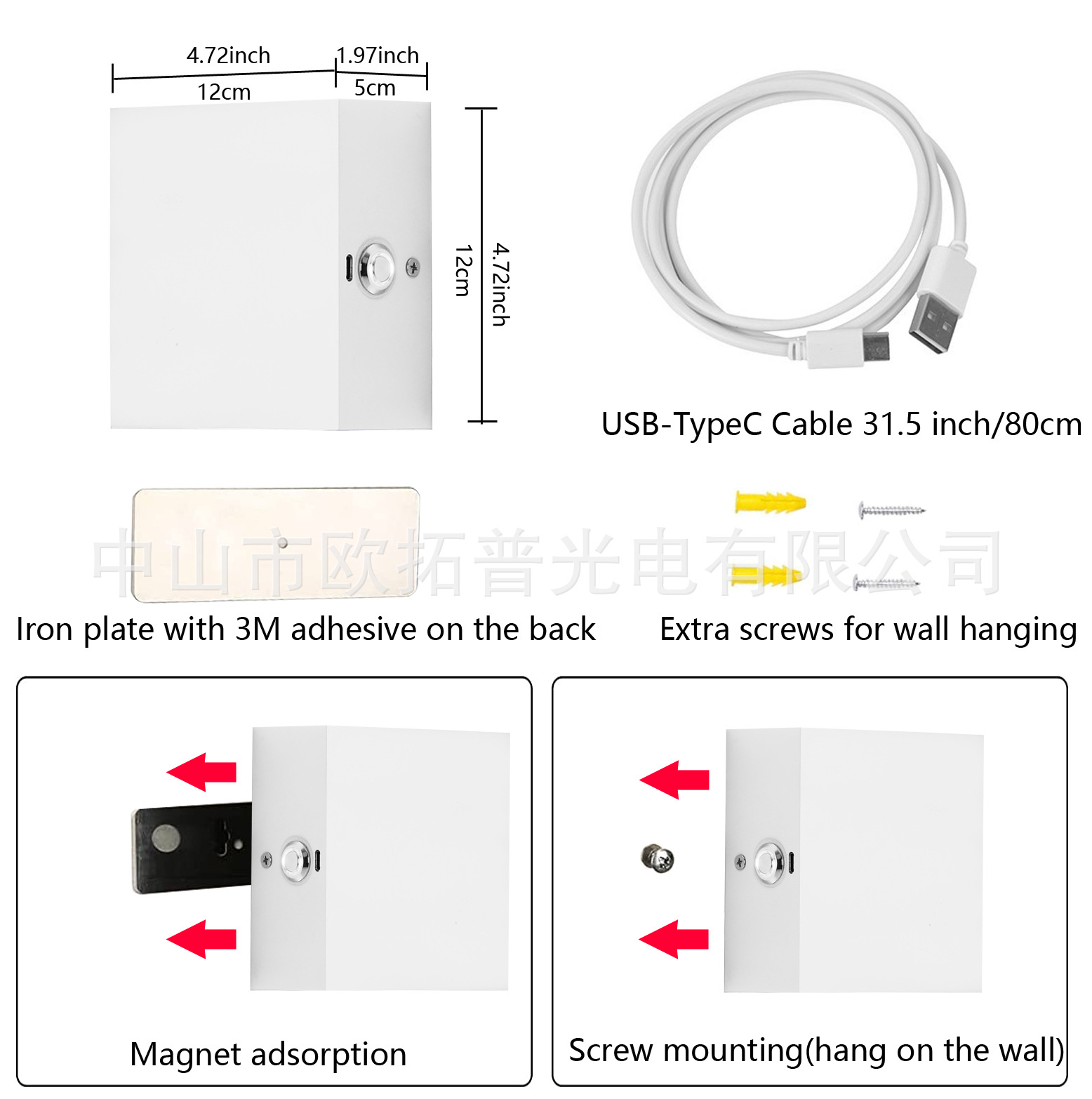 充电壁灯尺寸:120x120x50mm ,6瓦可代替常规12W亮度,