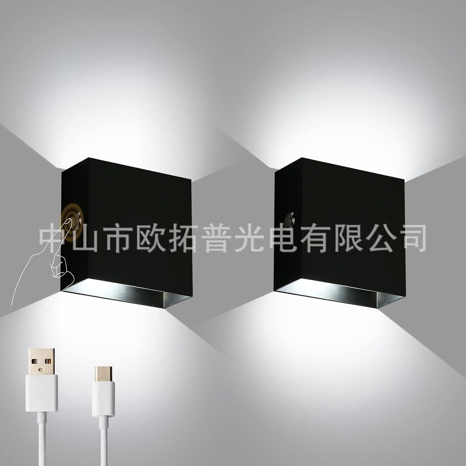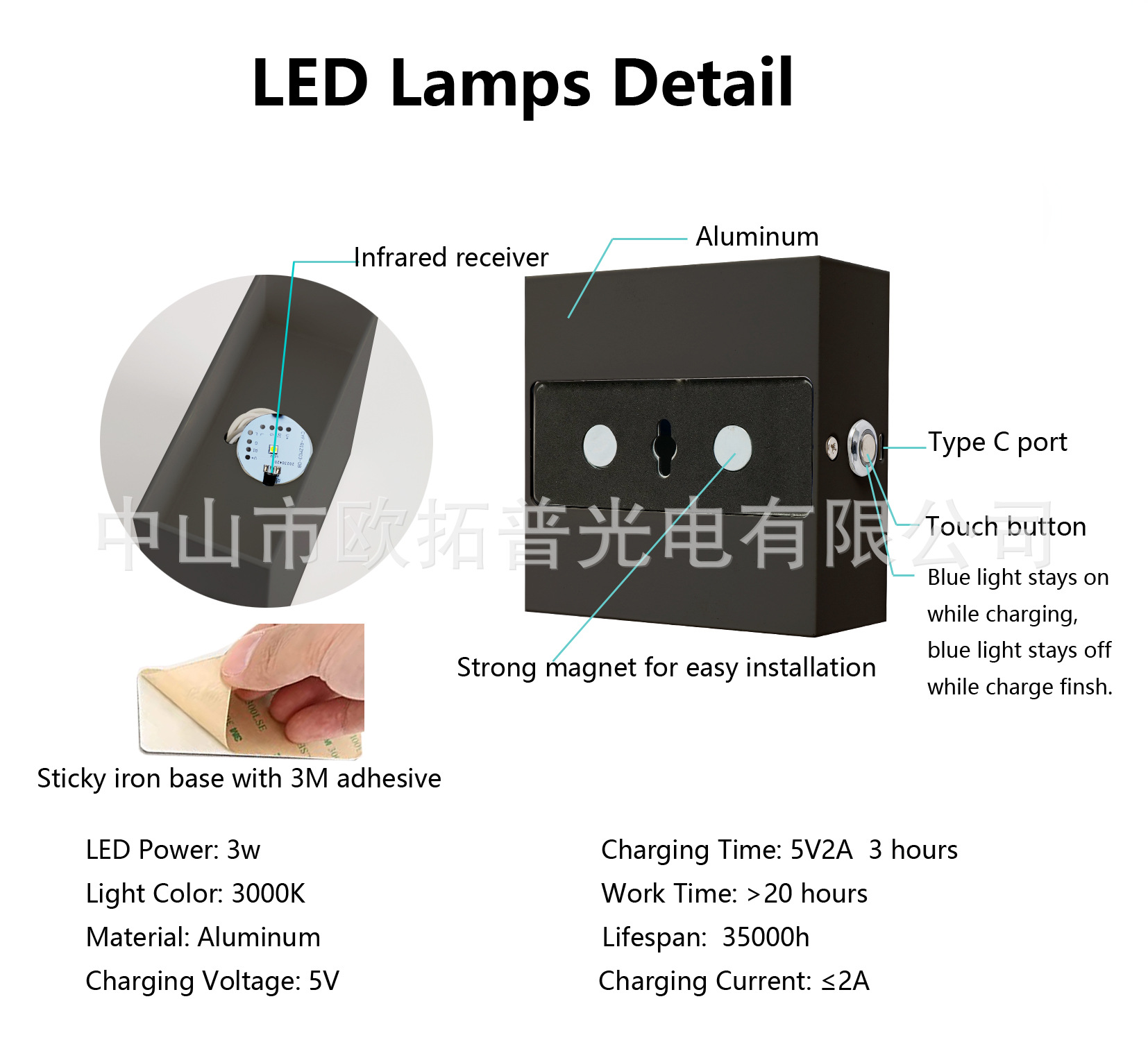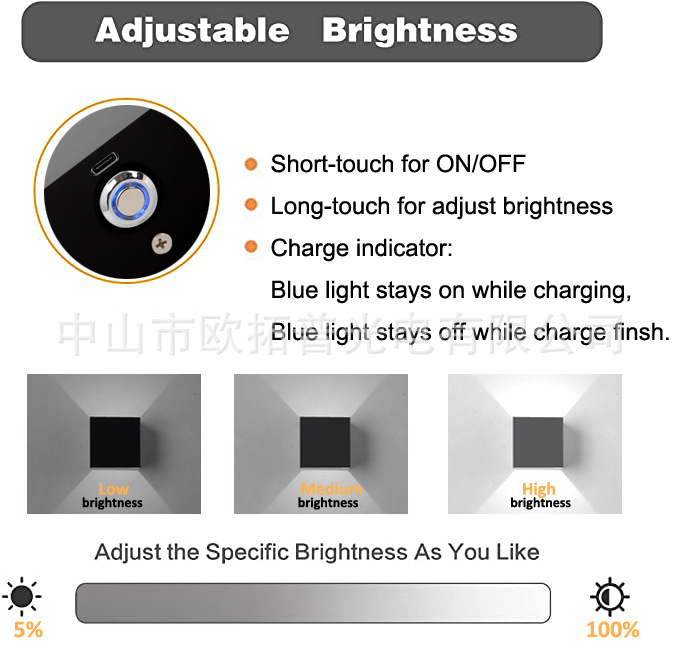 3.免布线充电壁灯,USB 5V充电,3200ma,充电3小时可点亮20小时(调到最亮的时候);轻按触摸开关,是开灯和关灯作用,长按是调暗,放开再长按是调亮