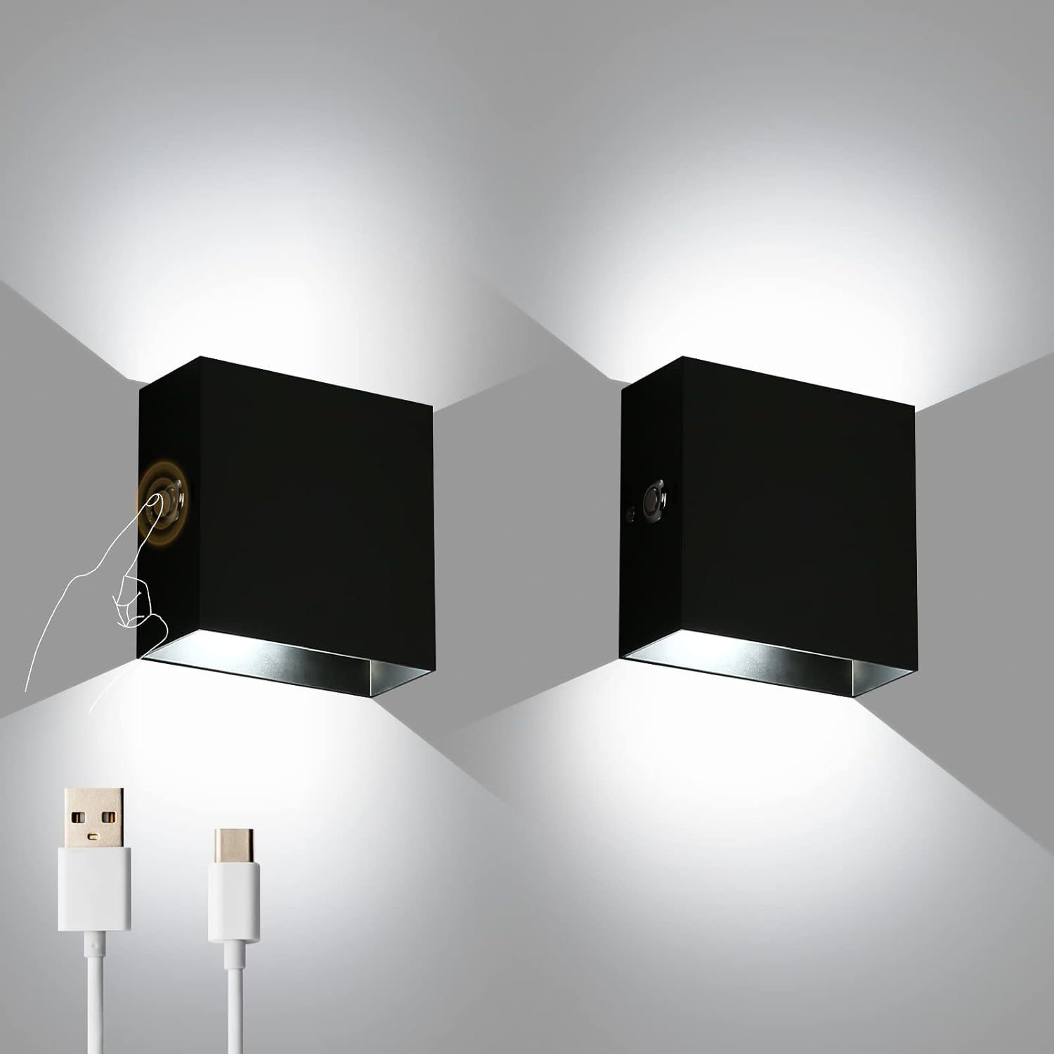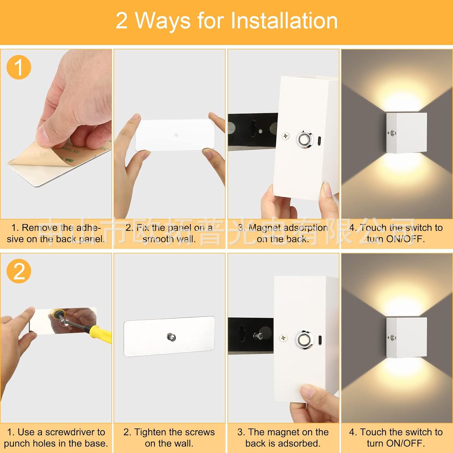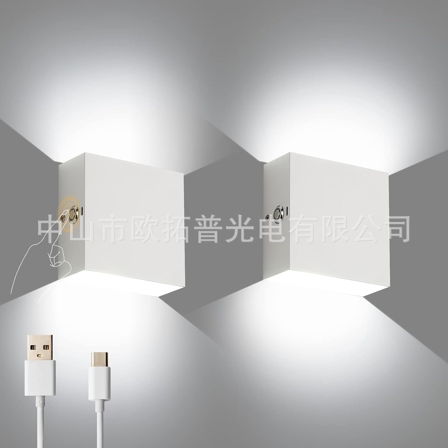 3.免布线充电壁灯,USB 5V充电,3200ma,充电3小时可点亮20小时(调到最亮的时候);轻按触摸开关,是开灯和关灯作用,长按是调暗,放开再长按是调亮