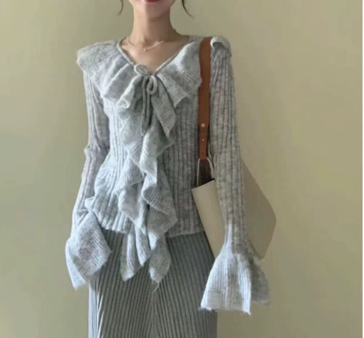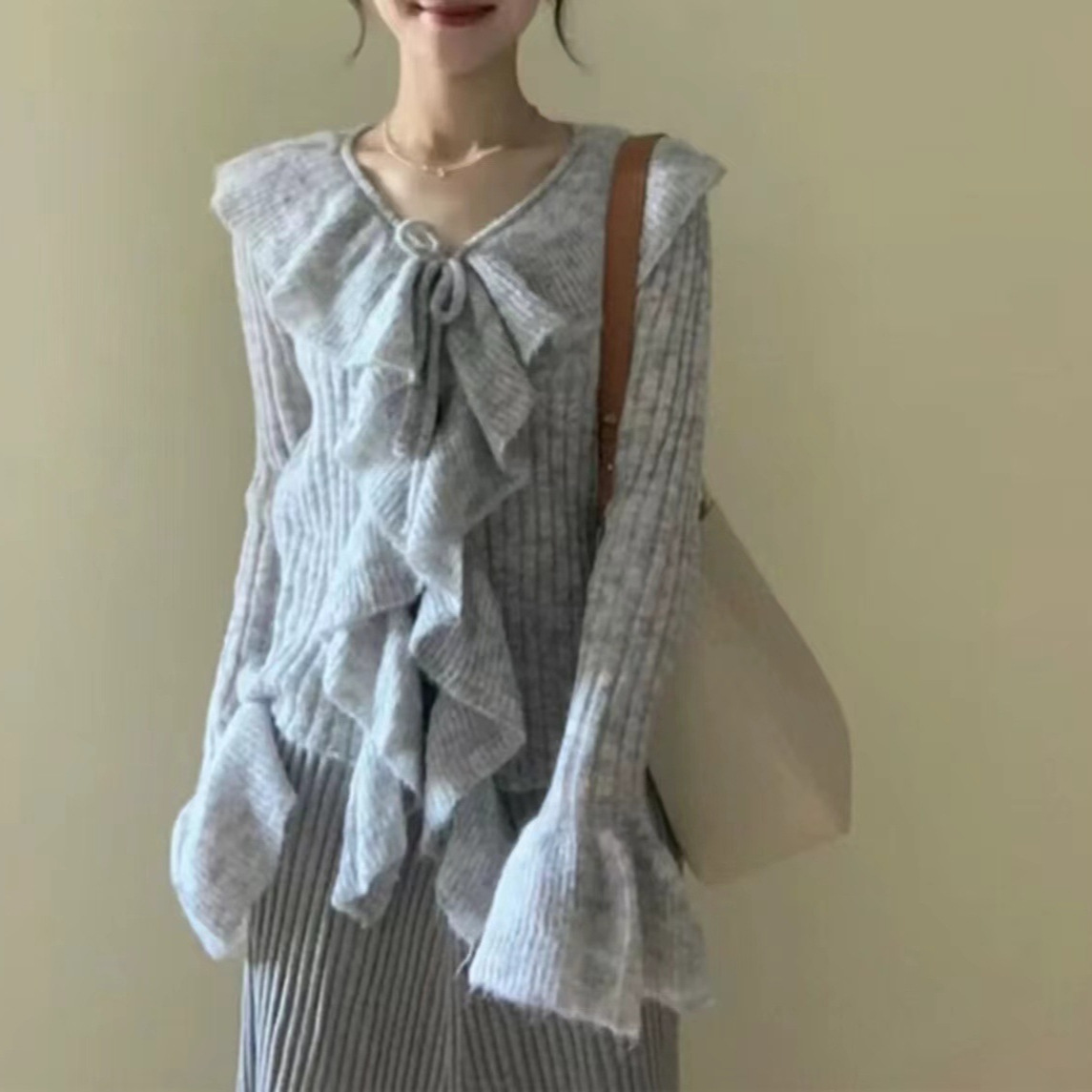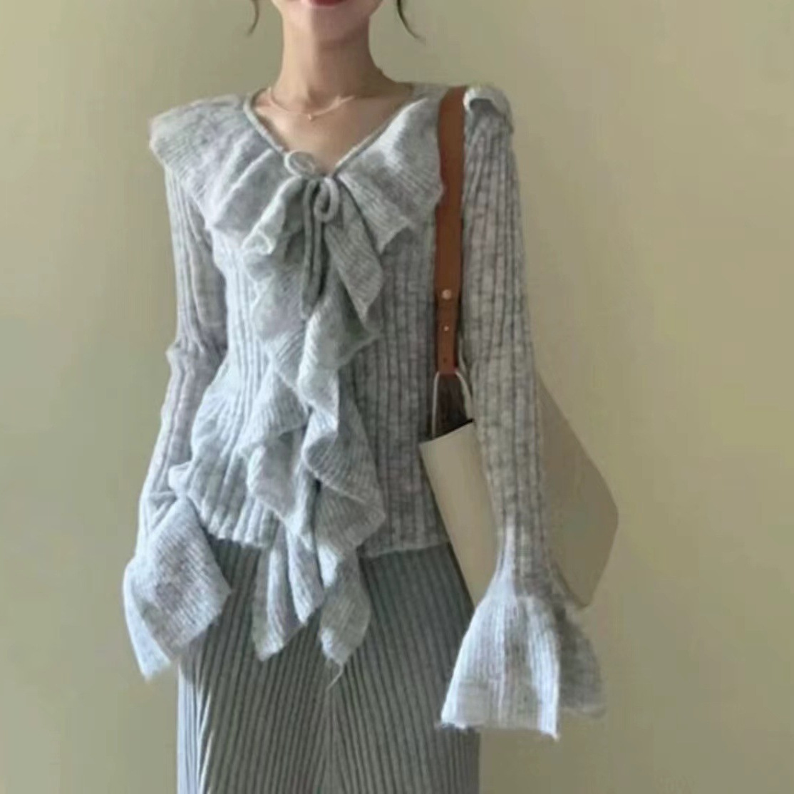 프랑스 스타일 우아한 V 넥 러플 호른 슬리브 니트 스웨터 여성용 봄과 가을 내부 스웨터 카디건 니치 칙 탑스토어 가기