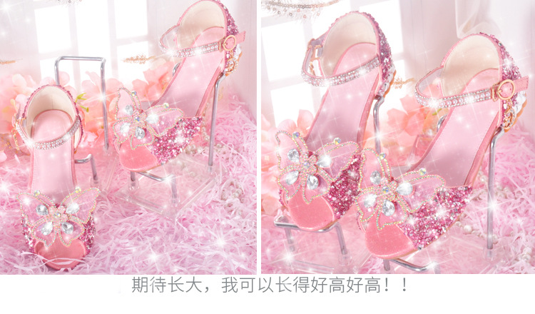 공주 아이샤 샌들 2024 여름 새로운 어린이 샌들 여성 크리스탈 소프트 솔 하이 엔드 걸스 하이힐 샌들