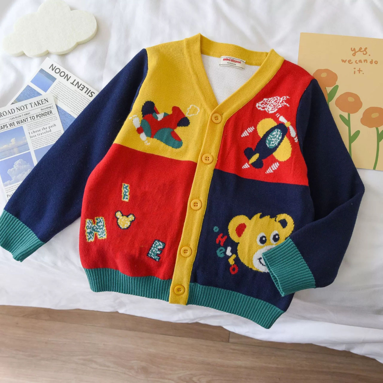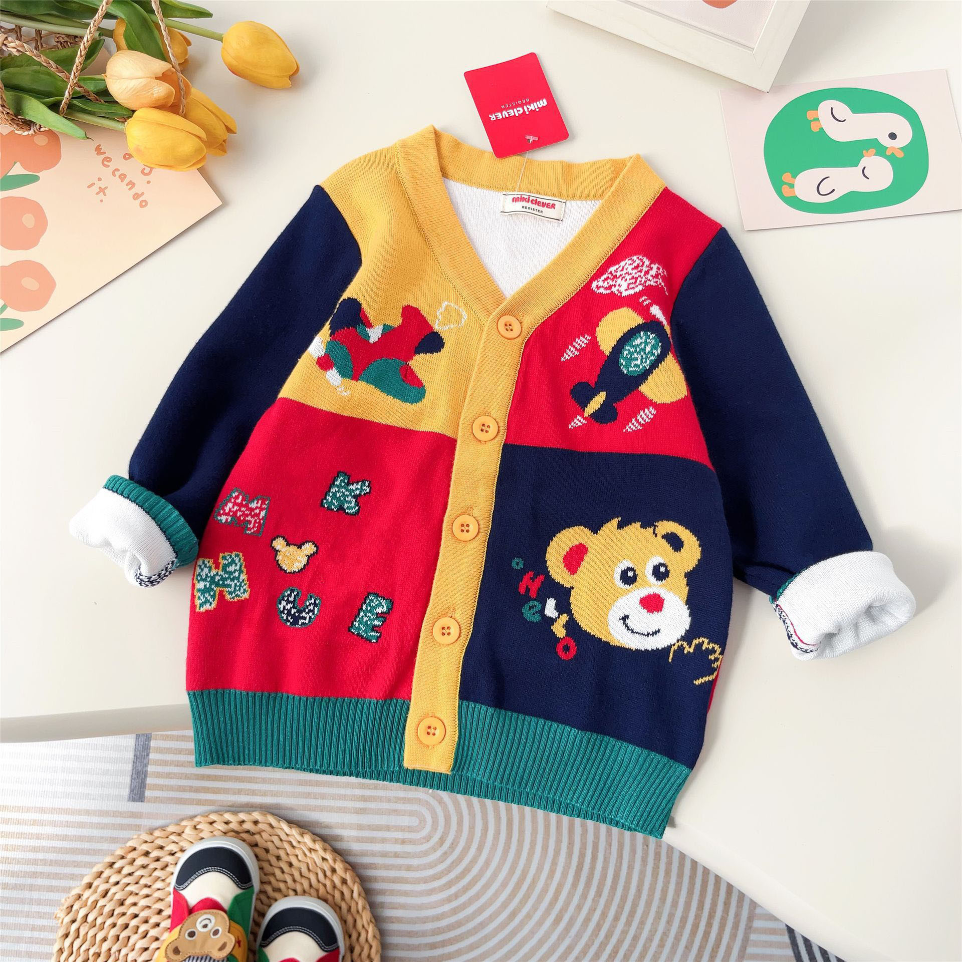 일본 스타일 곰돌이 체크 니트 가디건 24 봄 신상품 잠묵 아동복 스웨터 도매 2306