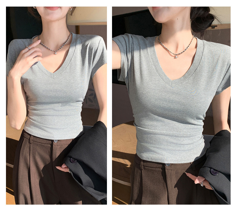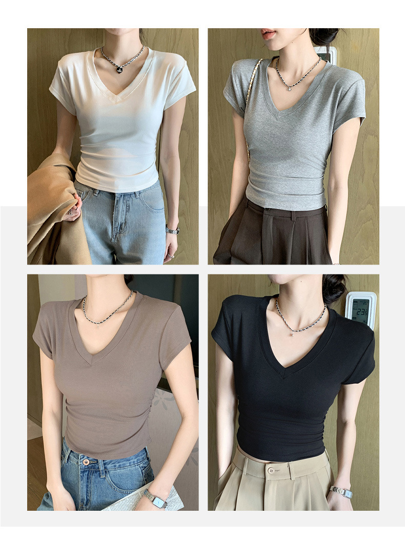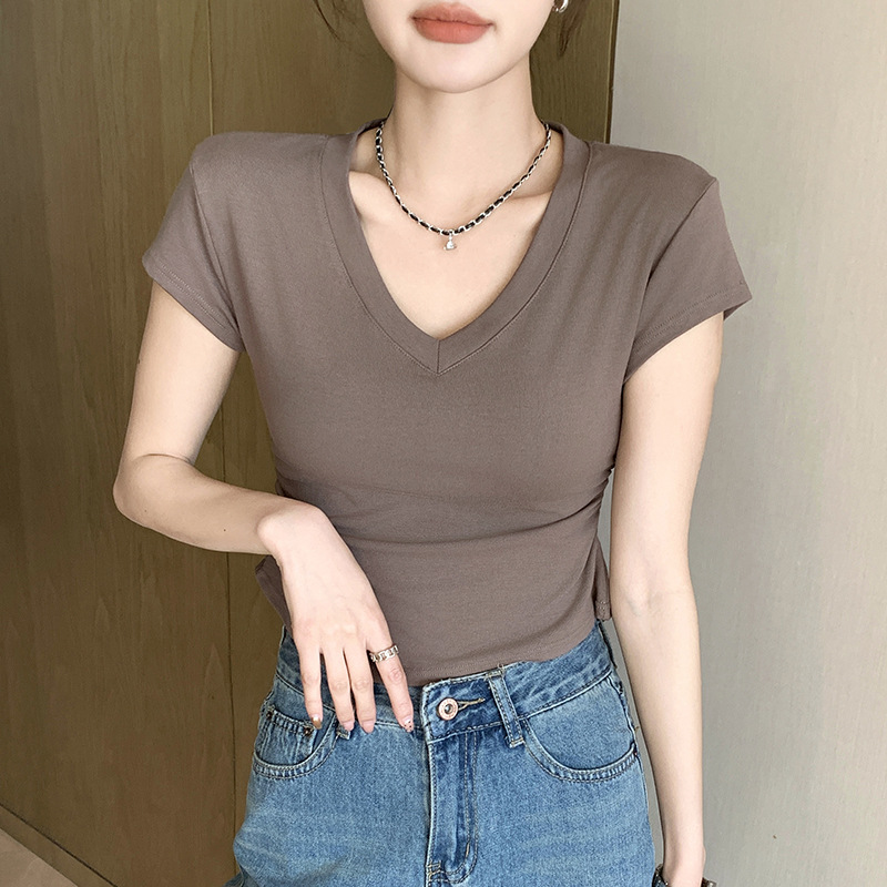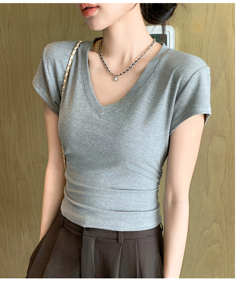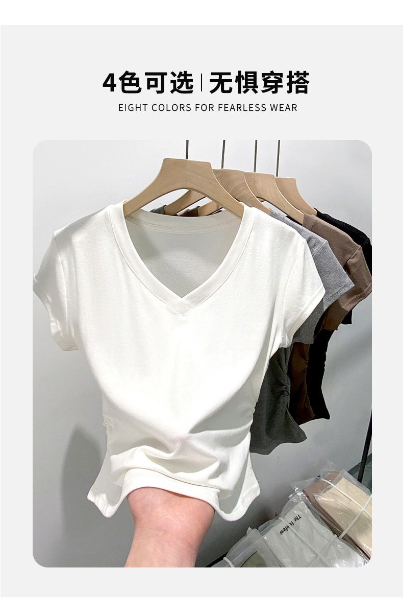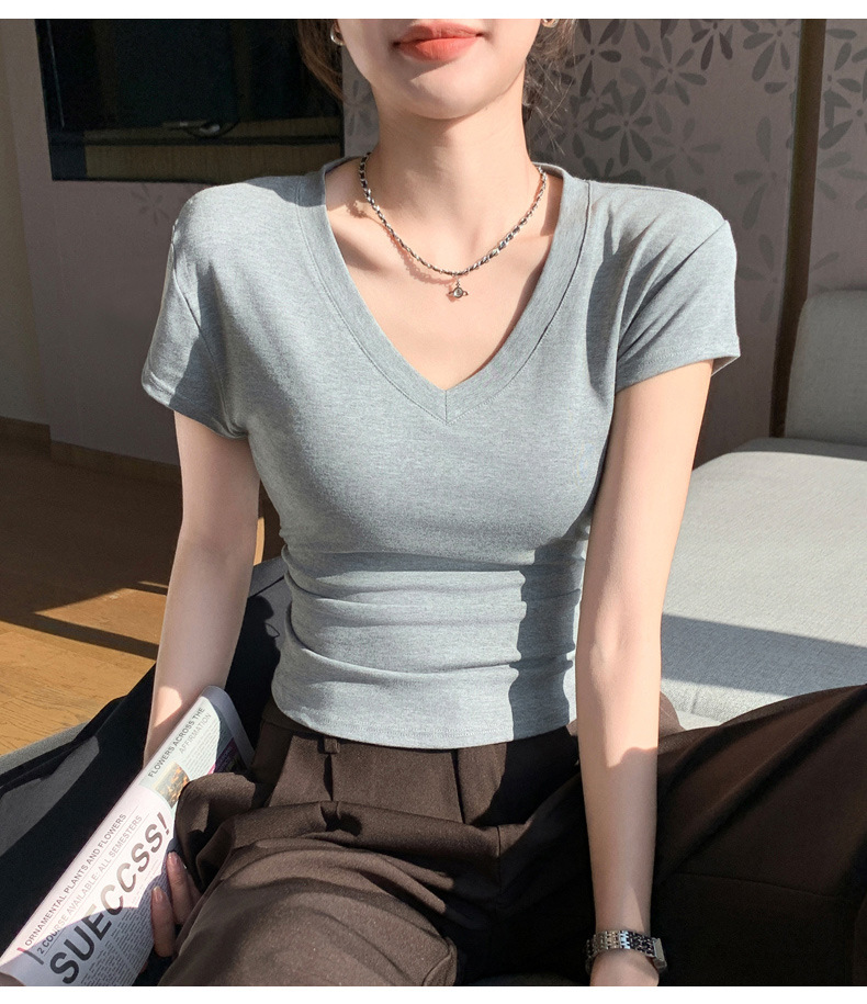 8302 여름 신상 슬림핏 V넥 반팔 주름 티셔츠 여성용 허리라인을 강조해 슬림해 보이는 고급스러운 탑, 틈새 시장 모델스토어 가기