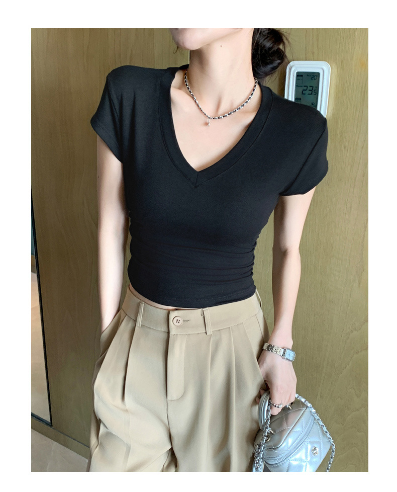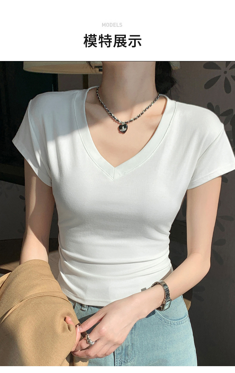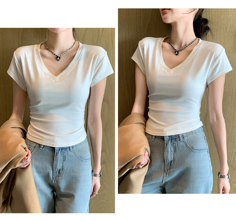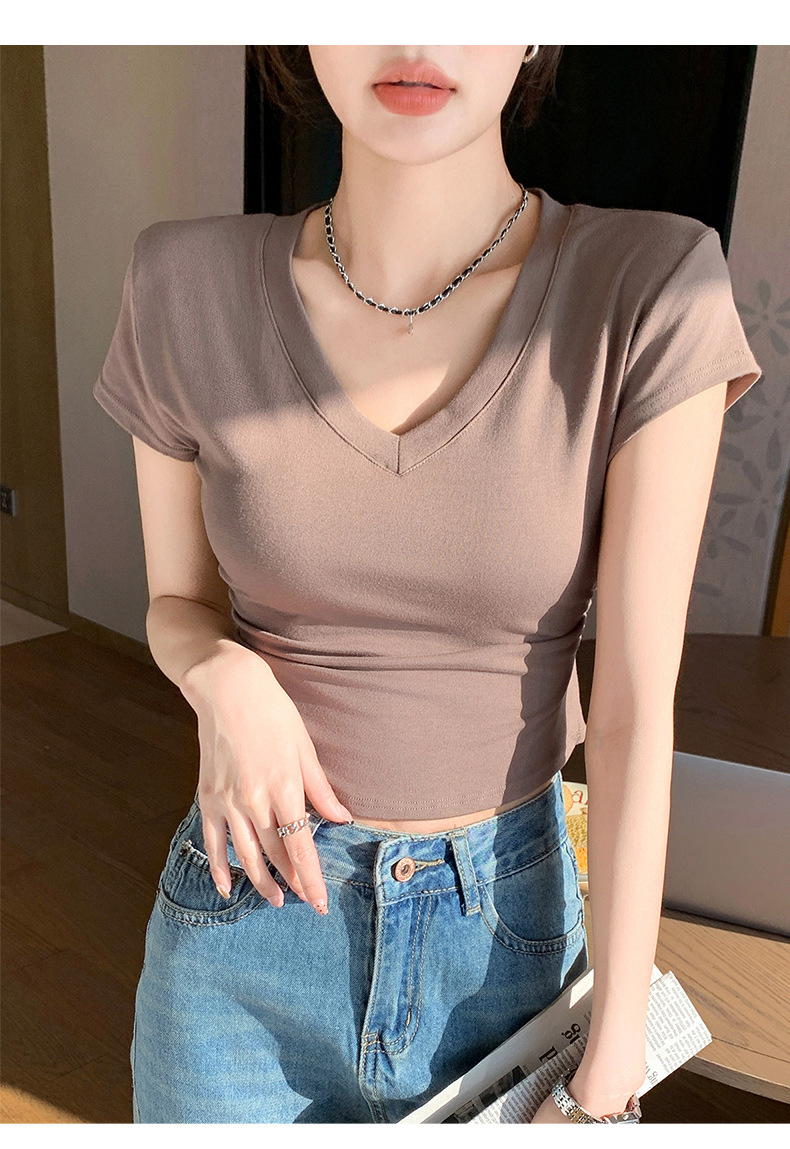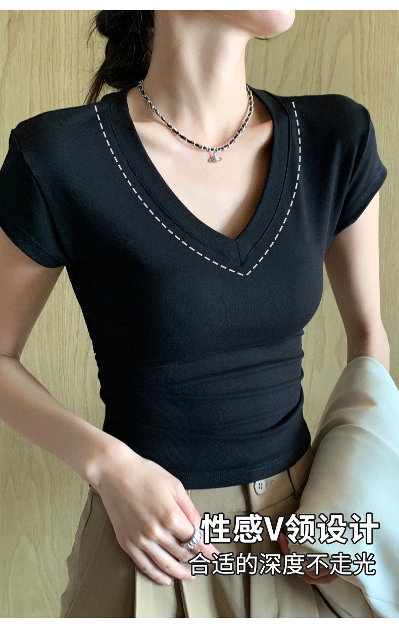 8302 여름 신상 슬림핏 V넥 반팔 주름 티셔츠 여성용 허리라인을 강조해 슬림해 보이는 고급스러운 탑, 틈새 시장 모델스토어 가기
