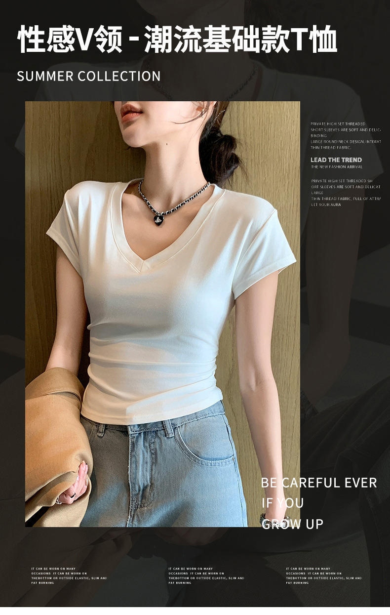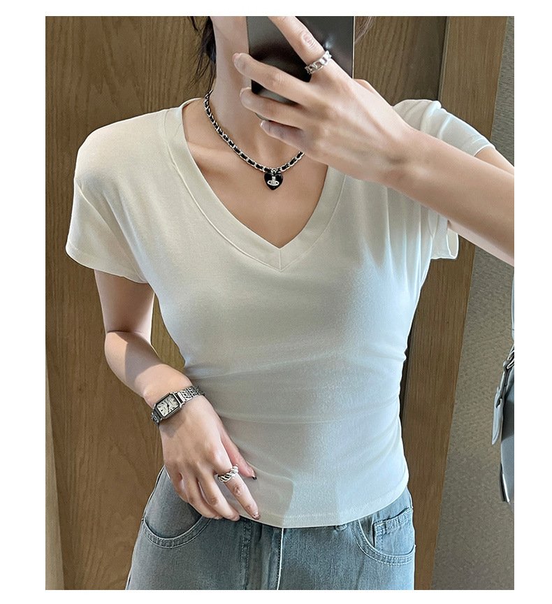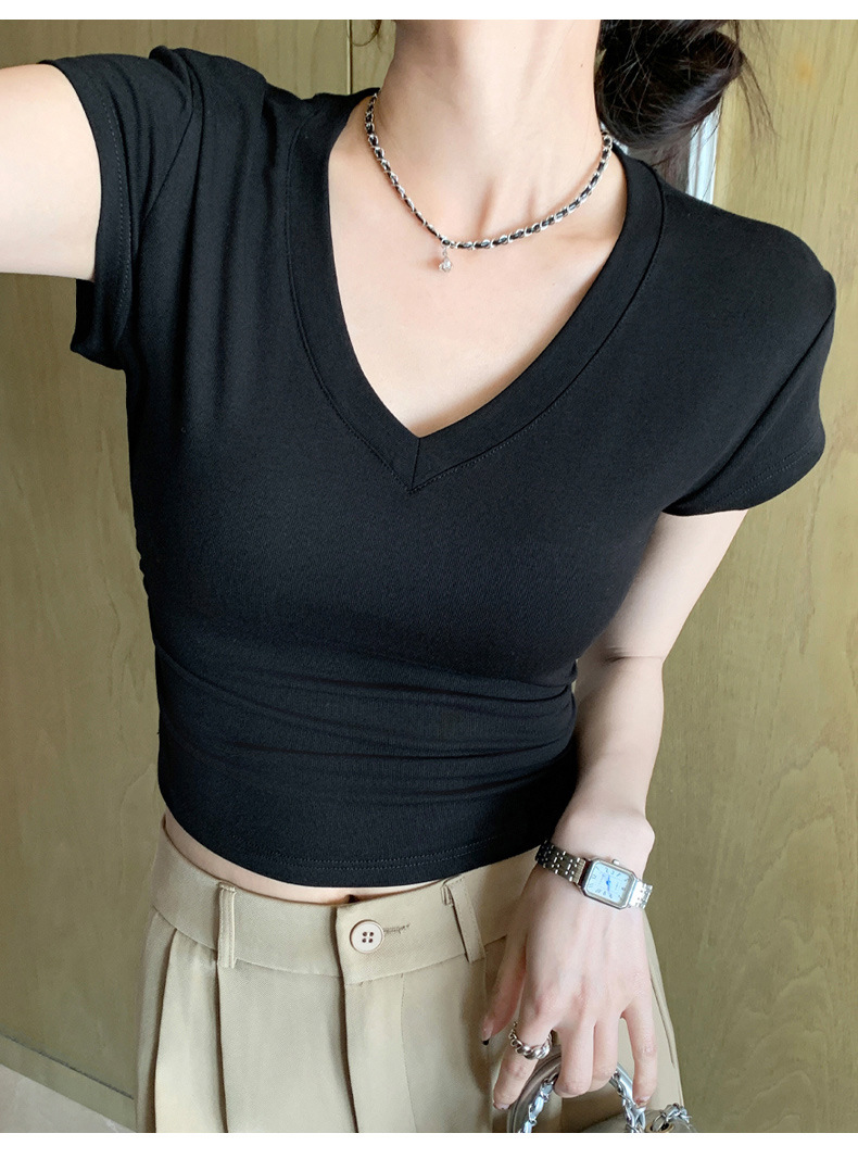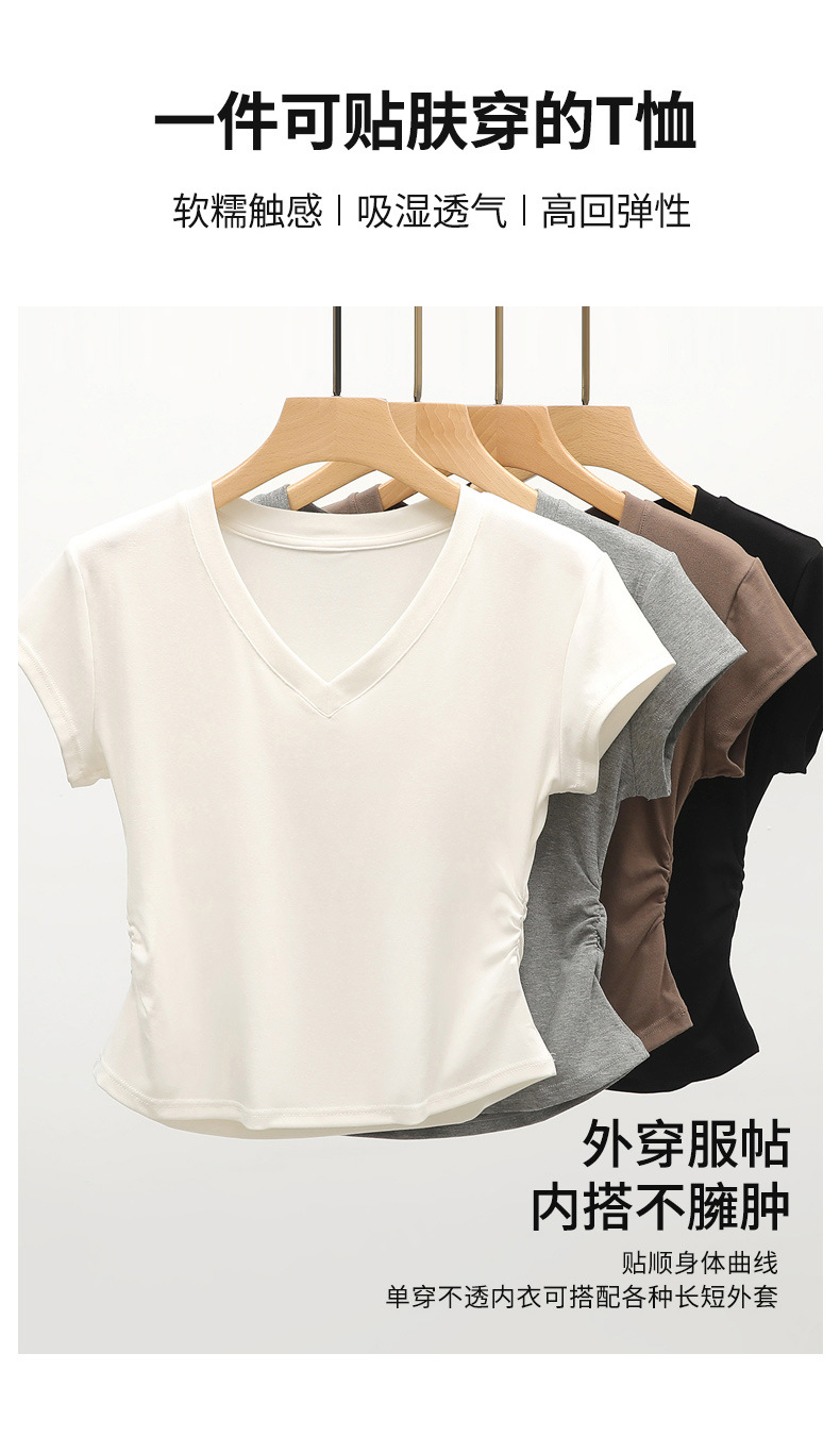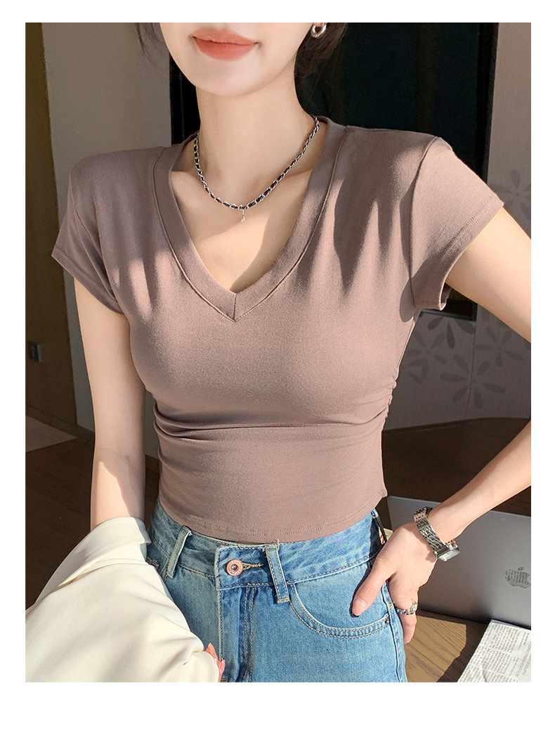 8302 여름 신상 슬림핏 V넥 반팔 주름 티셔츠 여성용 허리라인을 강조해 슬림해 보이는 고급스러운 탑, 틈새 시장 모델스토어 가기