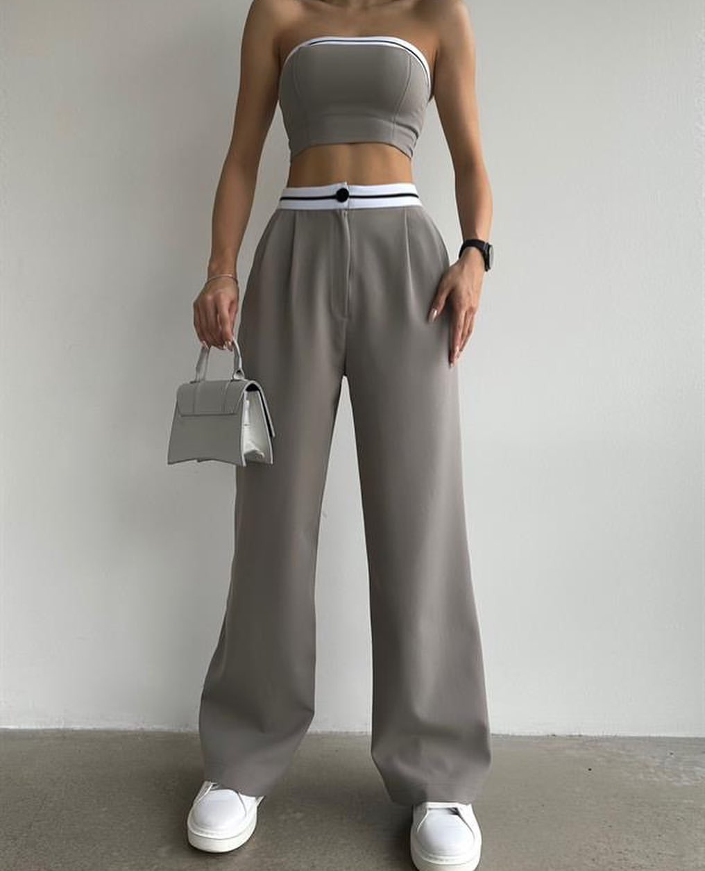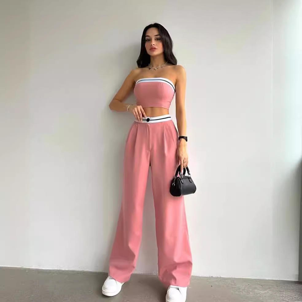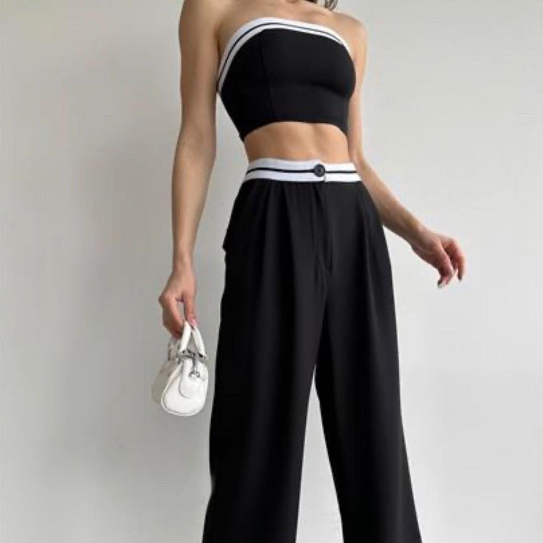 유럽과 미국의 대외 무역 여성 의류 새로운 뜨거운 여자 착용 스포츠 조끼 튜브 최고 대비 컬러 높은 허리 넓은 다리 바지 캐주얼 세트