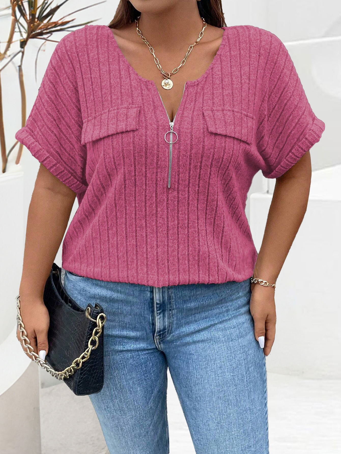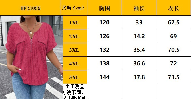 2024 아마존 봄과 여름 새로운 솔리드 컬러 대형 여성용 최고 지퍼 짧은 소매 가짜 포켓 풀오버 티셔츠 루즈스토어 가기