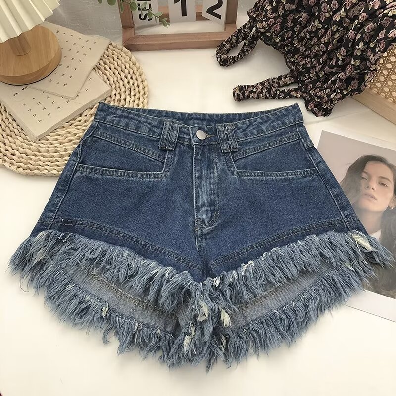 흰색 작은 높은 허리 뜨거운 소녀 술 데님 반바지 여성 여름 느슨한 핫팬츠 A 라인 넓은 다리 바지