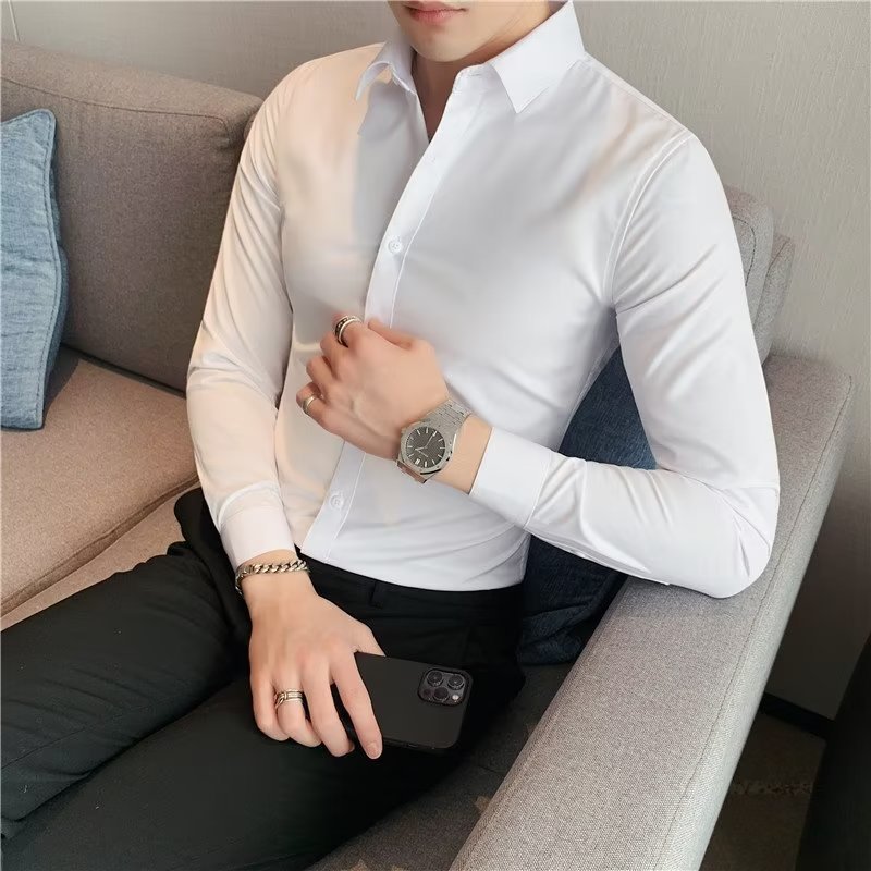 남성 셔츠 긴 소매 여름 슬림 핏 스트레치 비즈니스 2023 새로운 남성 세트 셔츠 남성 봄과 가을 셔츠