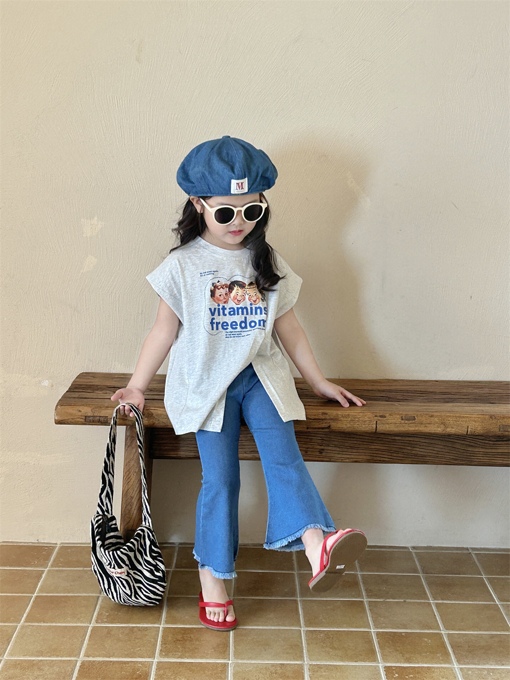 여아 청바지 얇은 여름 옷 2025 신상 한국판 아동 나팔바지 스트레치 중소형 아동 캐주얼 9부 바지스토어 가기