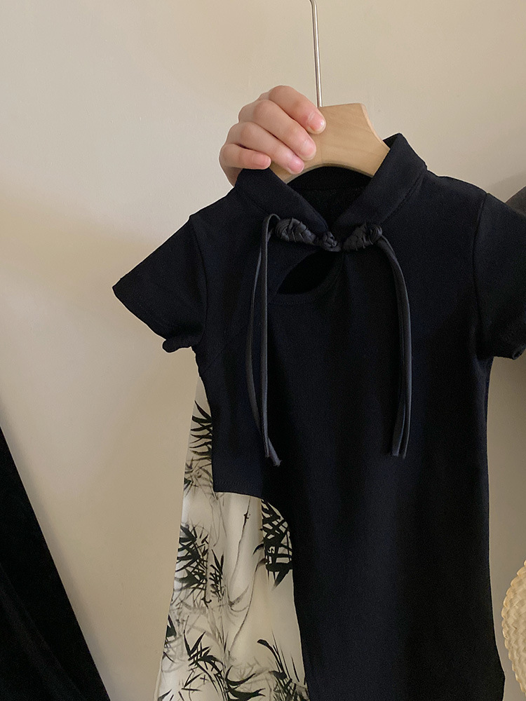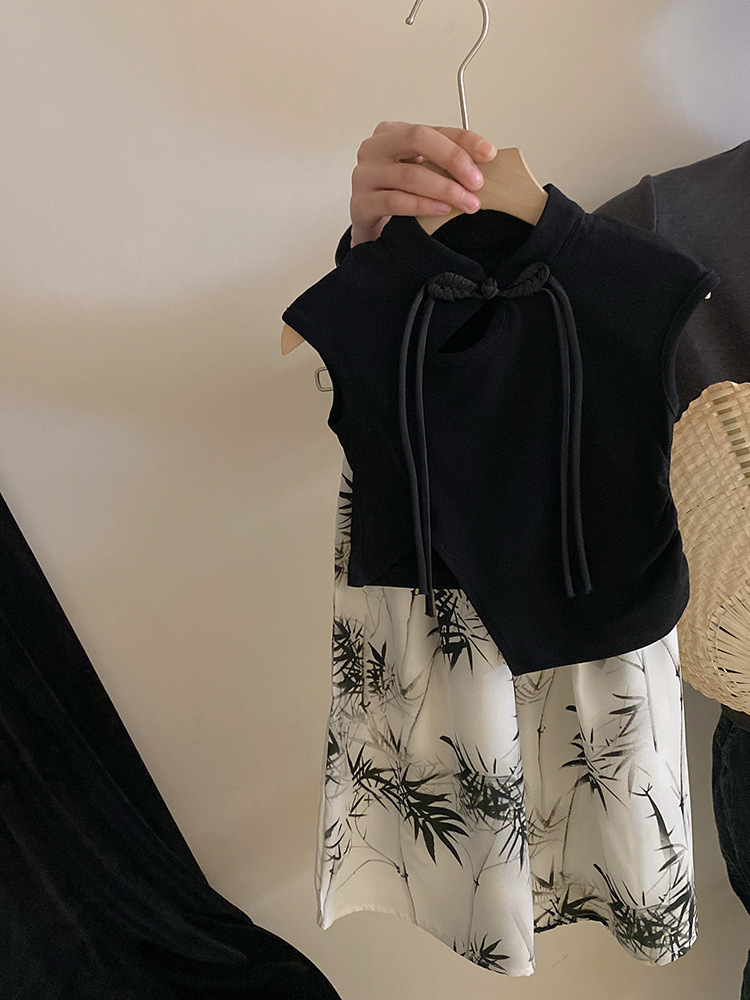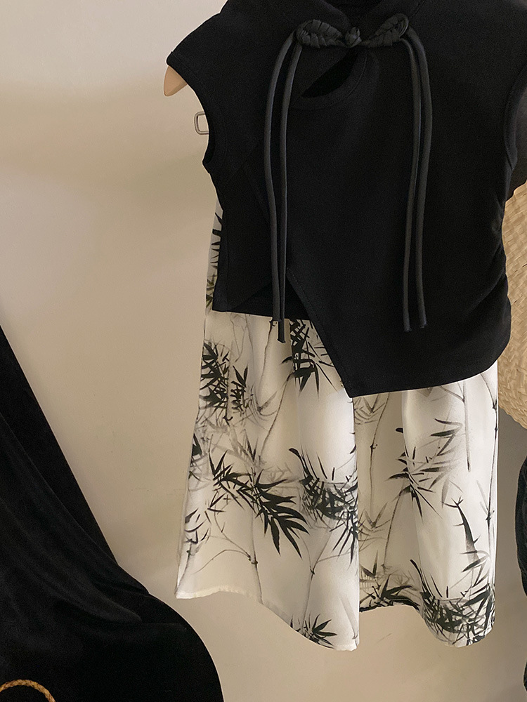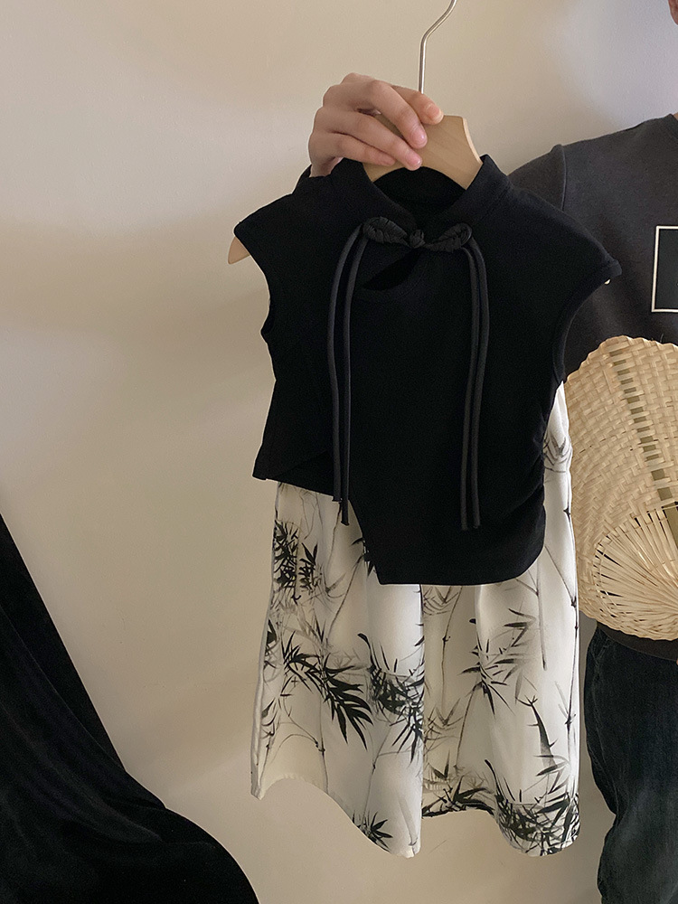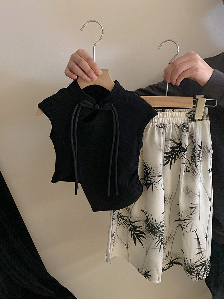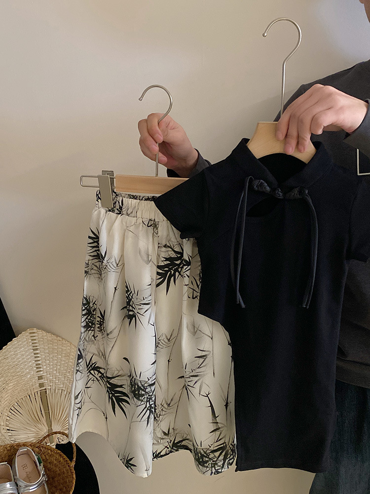 어린이 스타 라운드 새로운 중국 스타일 소녀 세트 버클 내셔널 스타일 패션 최고 기질 대나무 잎 잉크 그림 넓은 다리 바지 세트