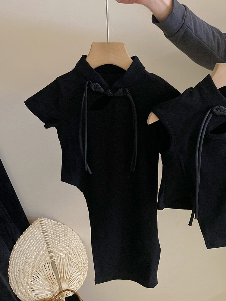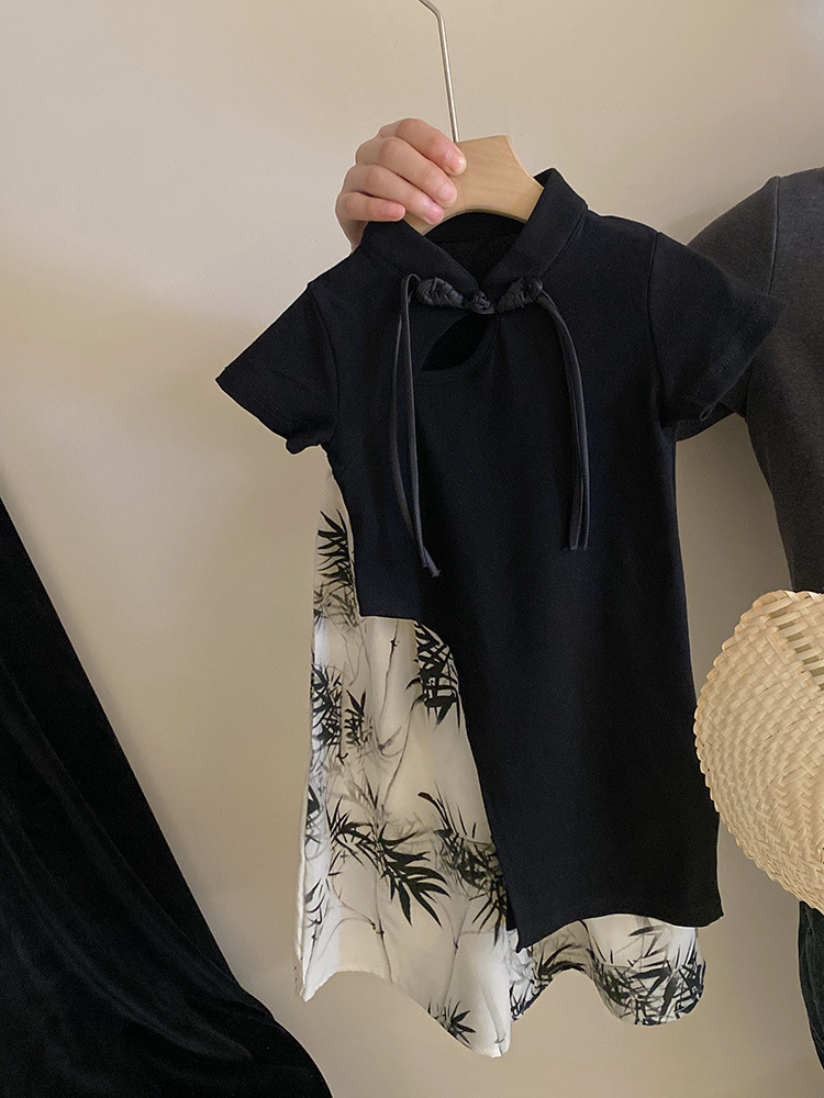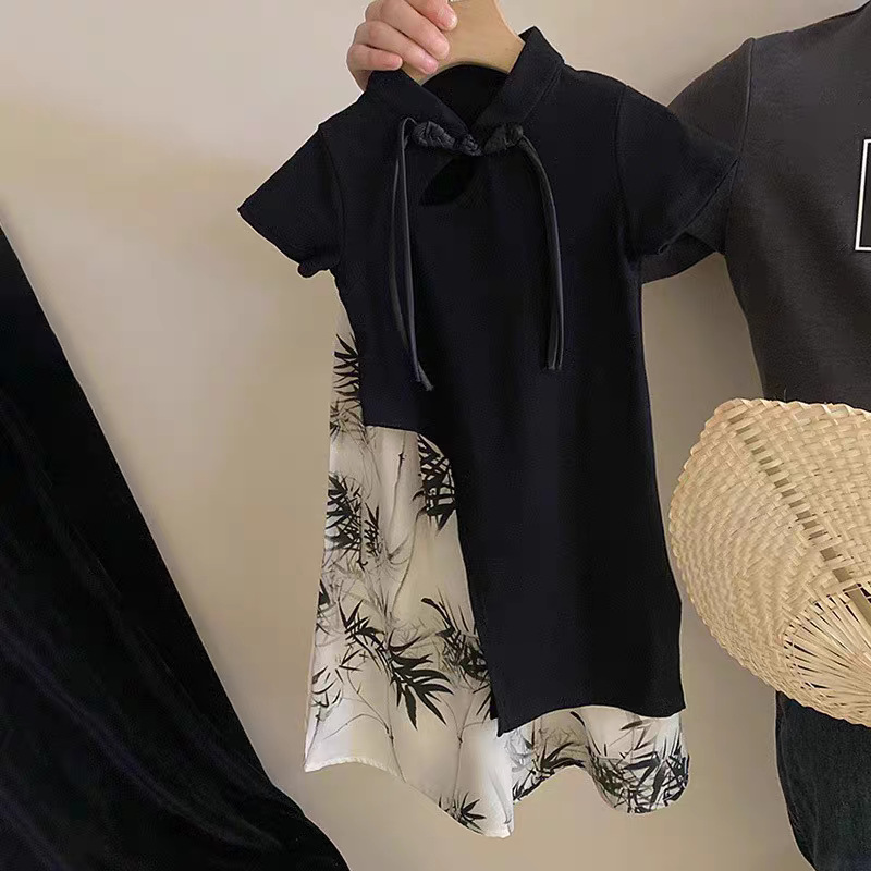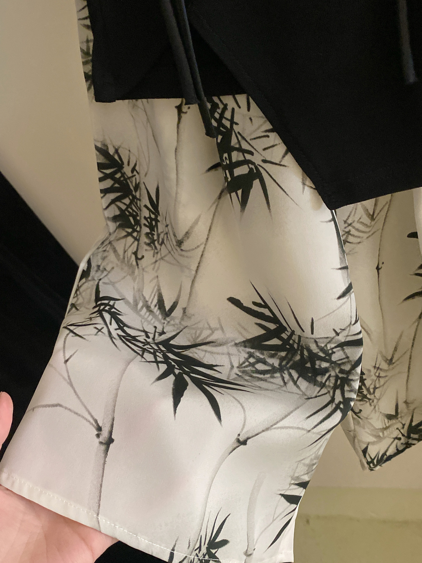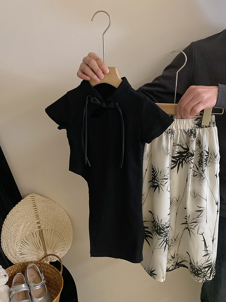 어린이 스타 라운드 새로운 중국 스타일 소녀 세트 버클 내셔널 스타일 패션 최고 기질 대나무 잎 잉크 그림 넓은 다리 바지 세트