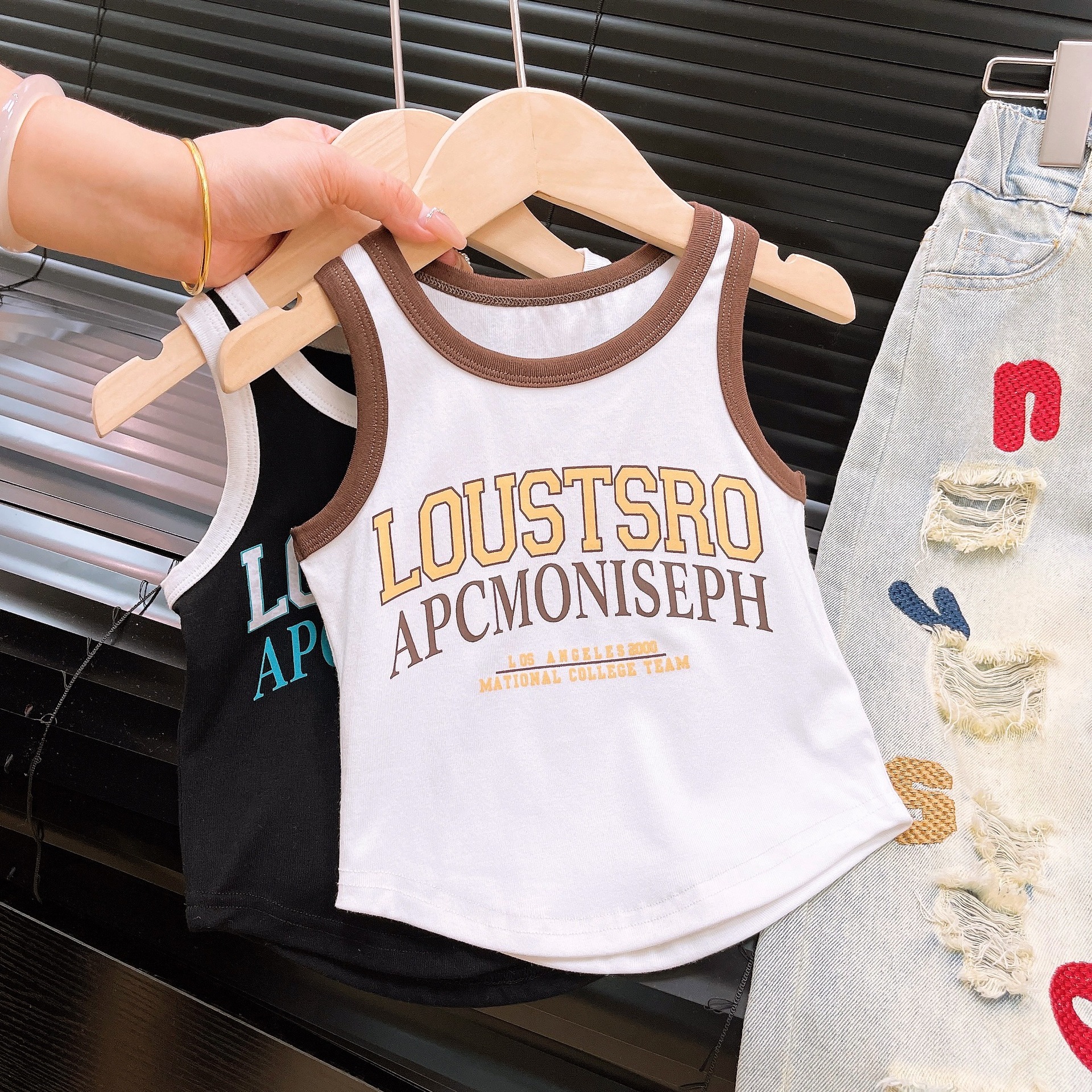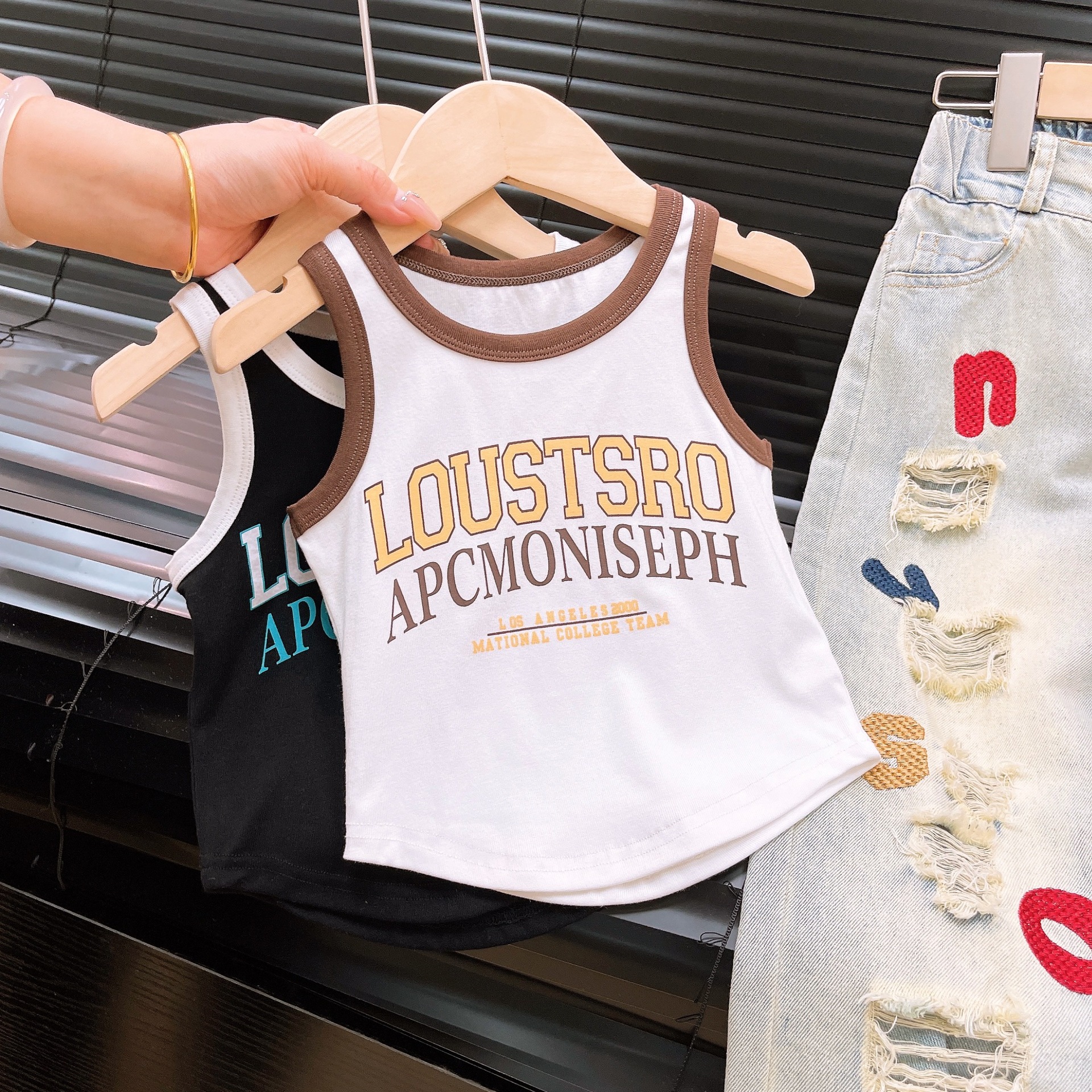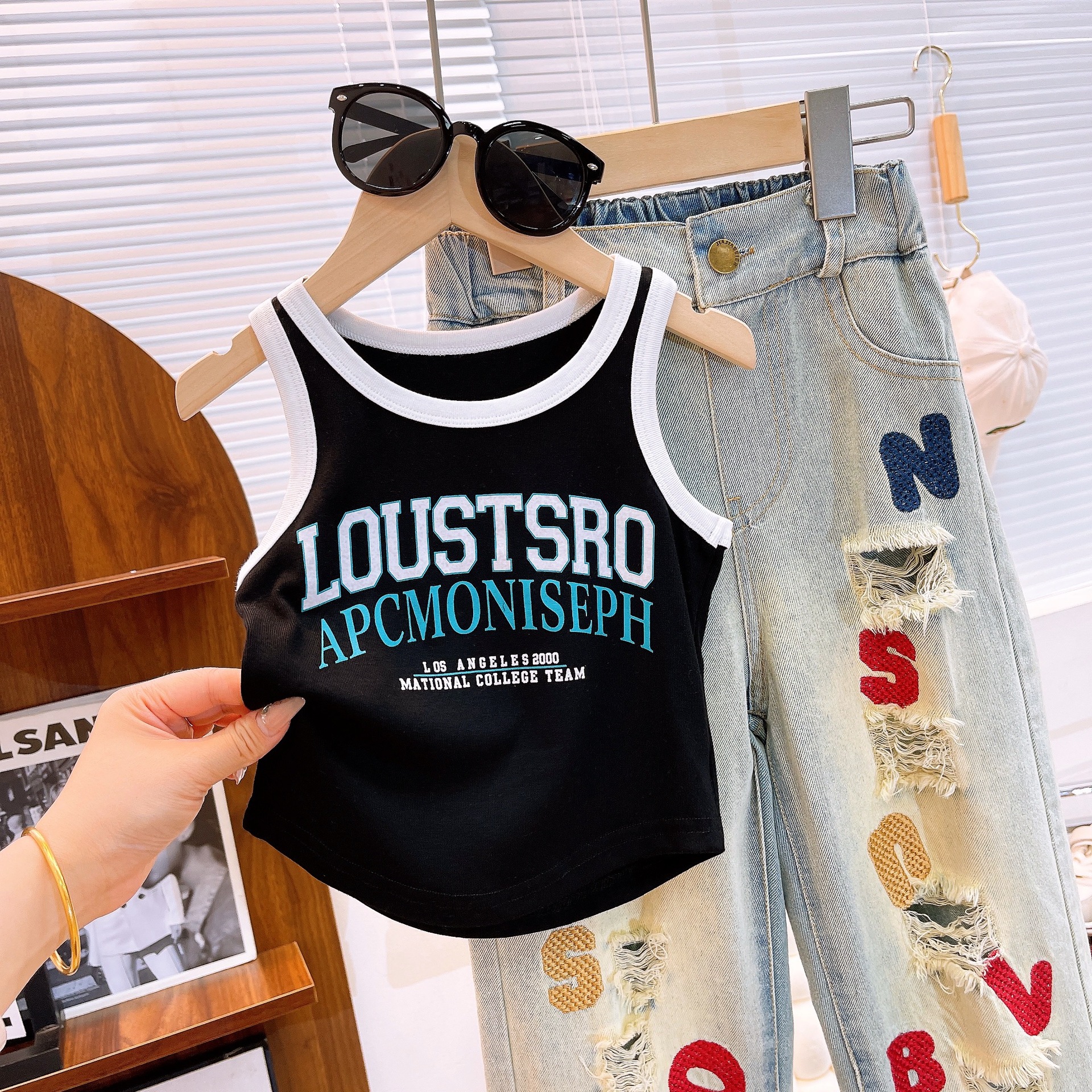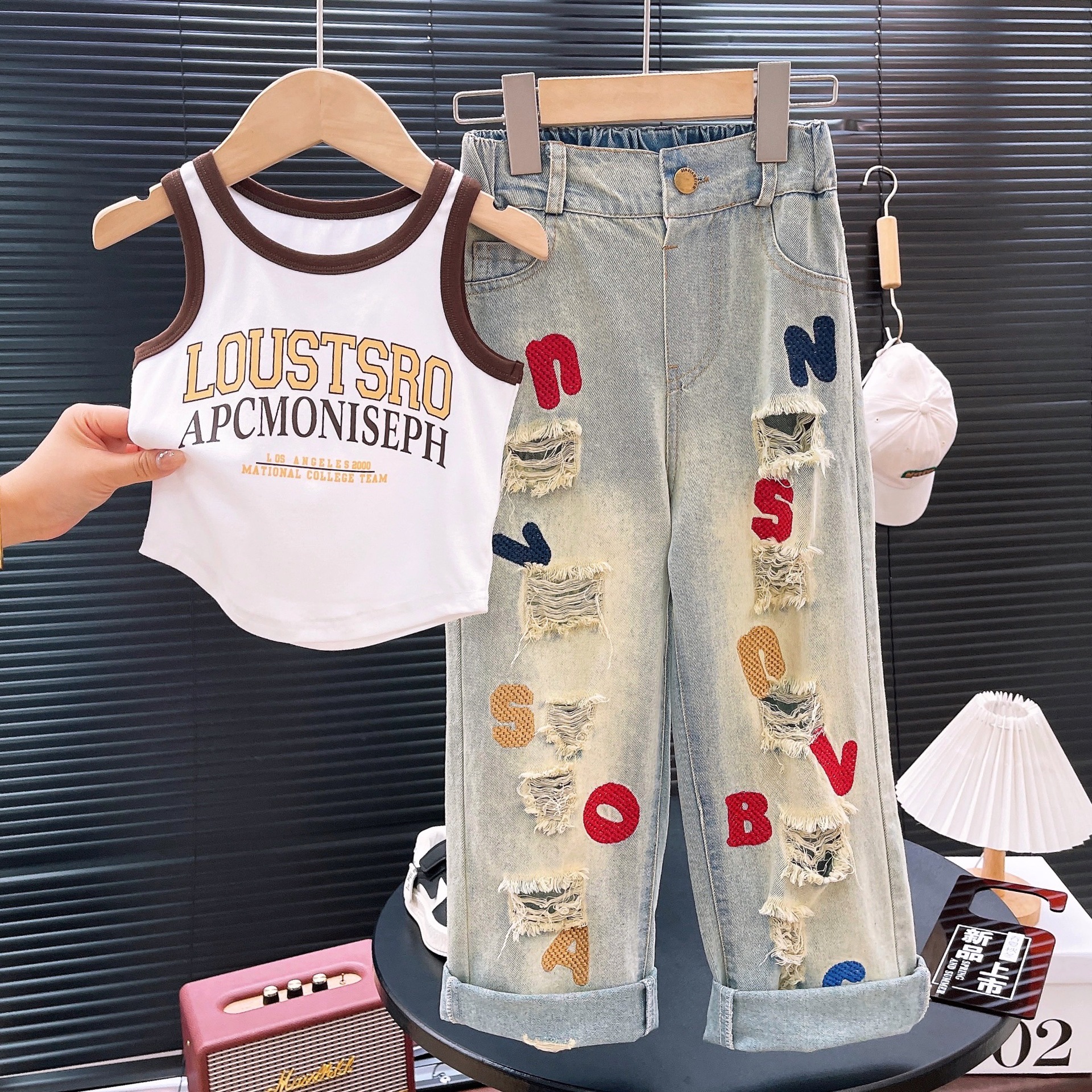 Ancorelala2024 봄과 여름 소녀 세트 중형 및 대형 어린이 패션 티셔츠 찢어진 글자 수 놓은 청바지