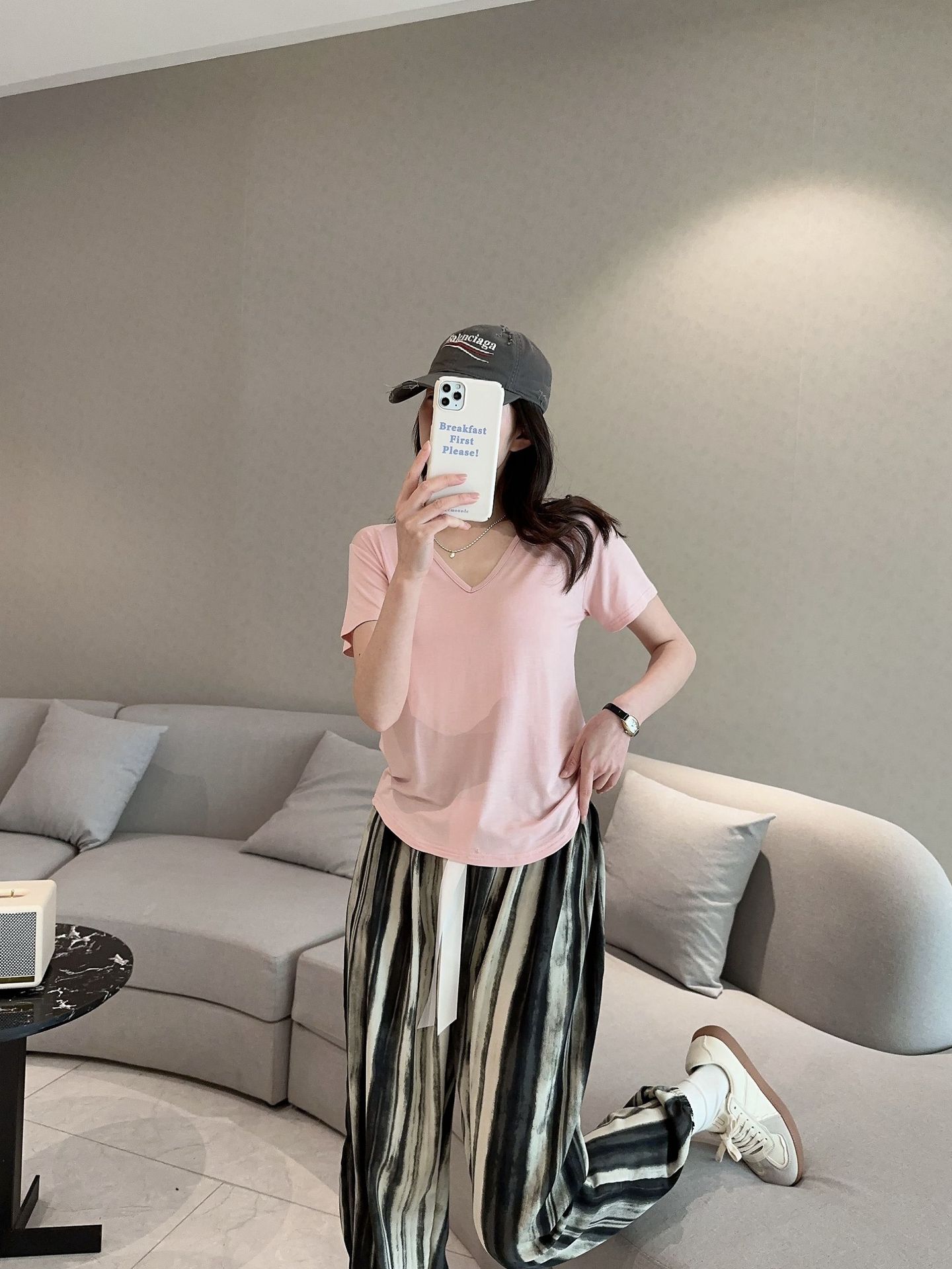 V 넥 모달 반팔 티셔츠 여성용 여름 플러스 사이즈 얇은 내부 착용 느슨한 간단한 단색 겉옷 반팔 탑
