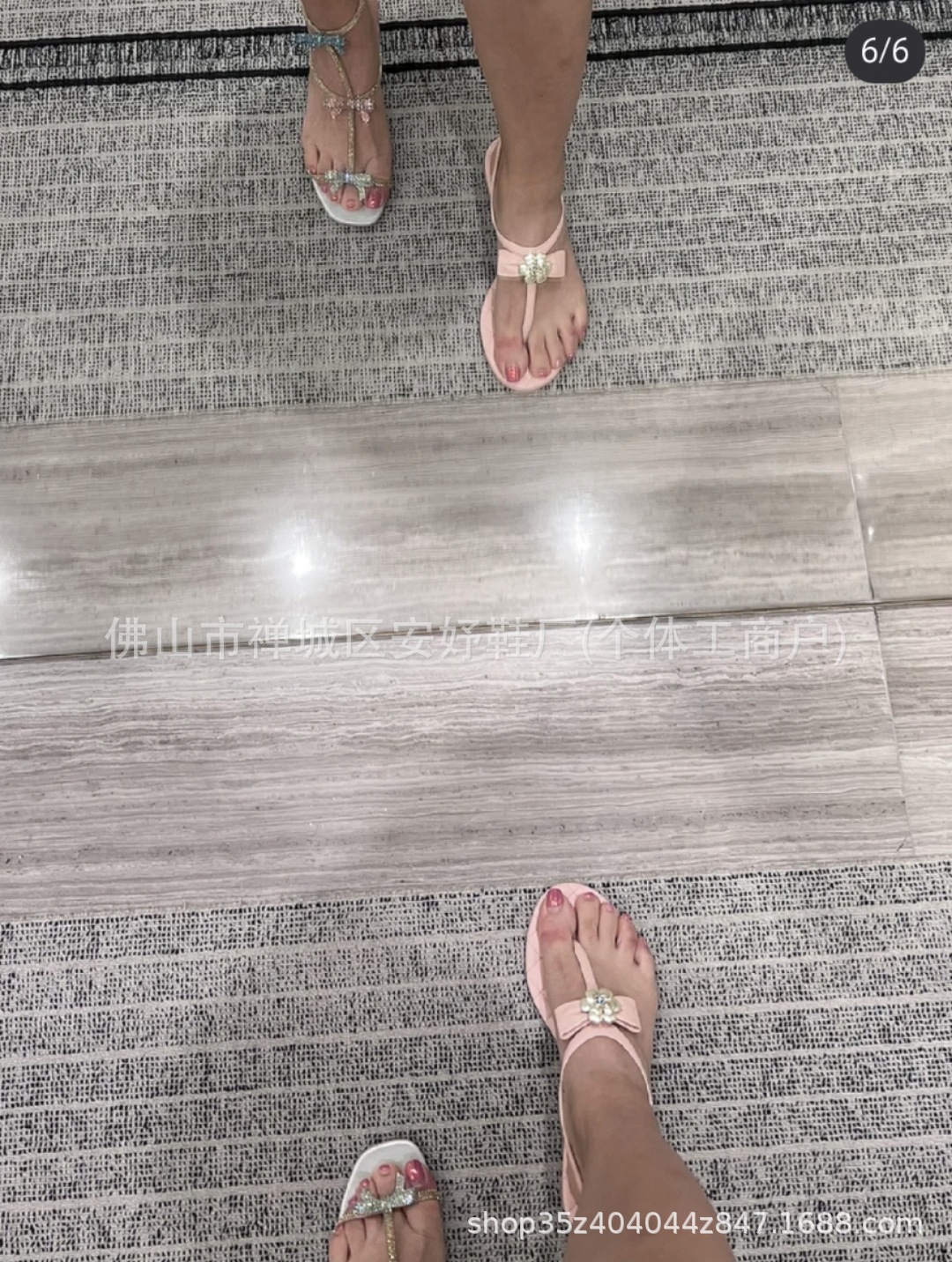 2024 조커 샌들 봄과 여름 새로운 꽃 다이아몬드 버클 활 클립 발가락 플랫 샌들 여성을위한 한 단어스토어 가기