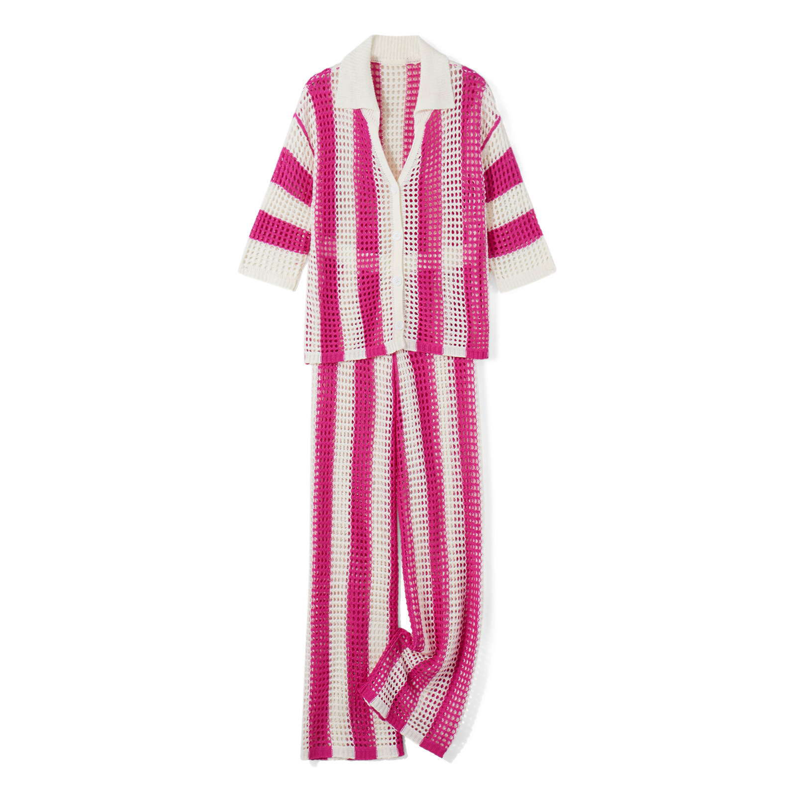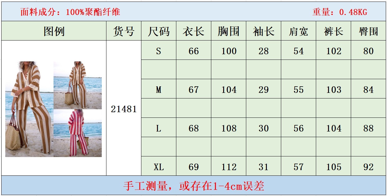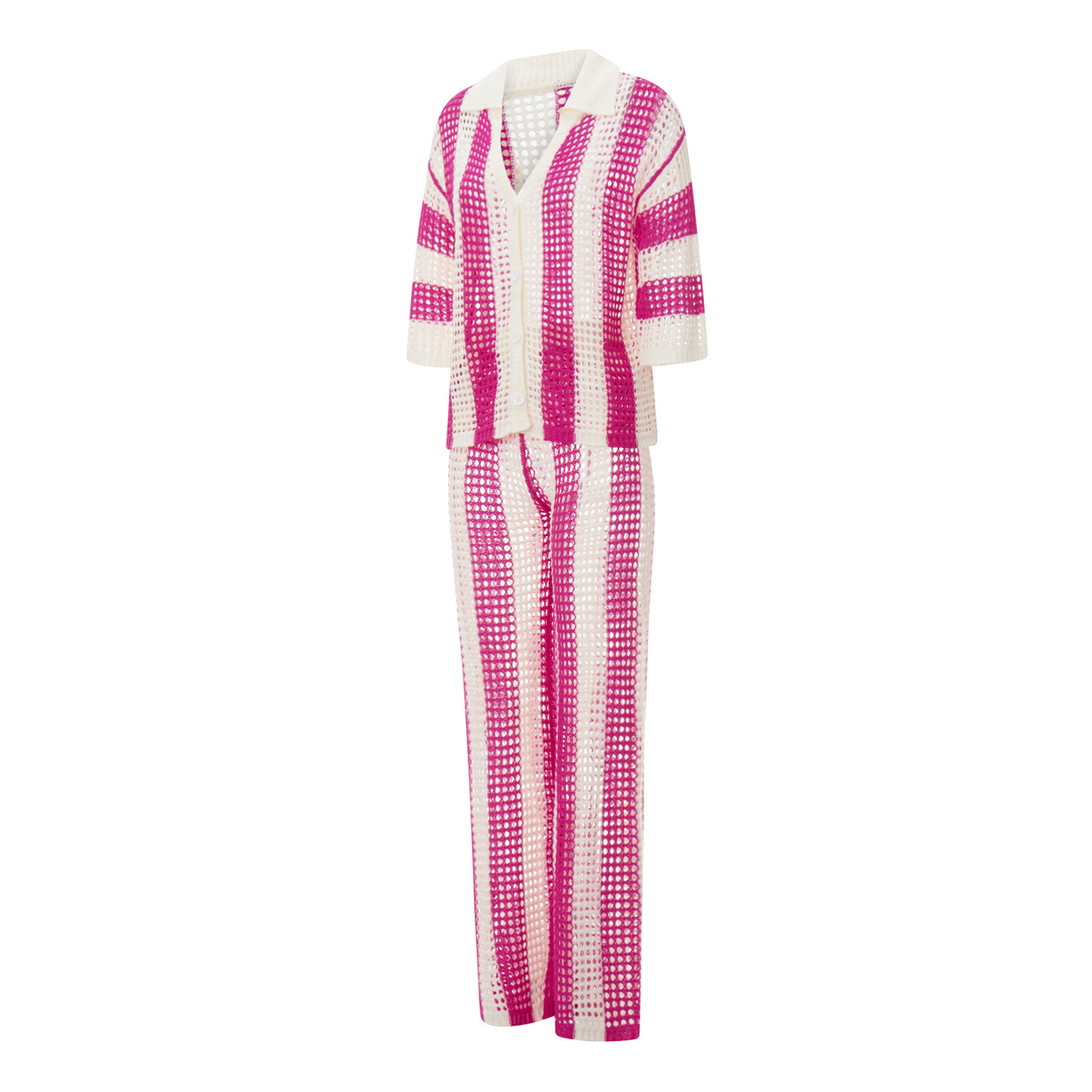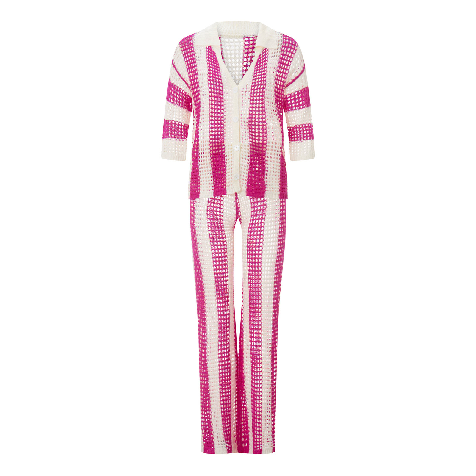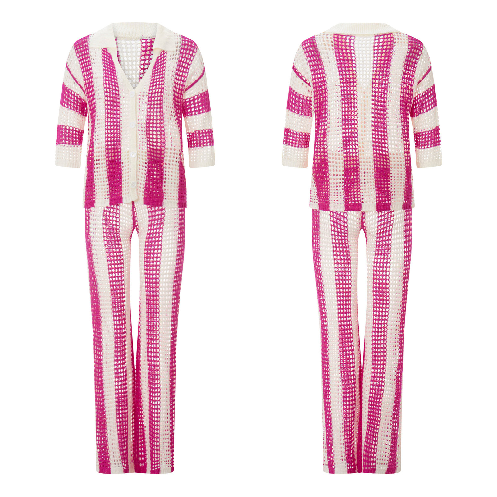 여름 유럽과 미국의 여성 의류 아마존 2024 패션 V-넥 중공 셔츠 느슨한 니트 넓은 다리 바지 세트