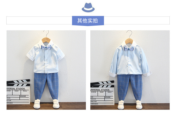 • 블루 스타 도트 짧은 소매 + 블루 체크 무늬 바지 + 나비 넥타이 스트랩