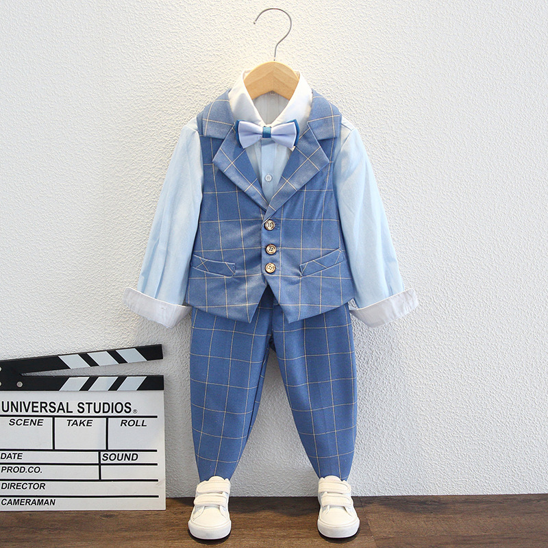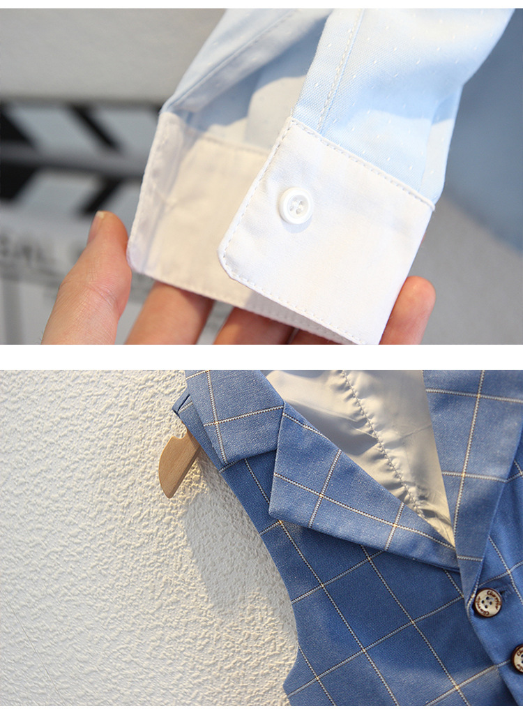 • 블루 체크 무늬 조끼 + 블루 체크 무늬 바지 + 블루 스타 도트 긴 소매 나비 넥타이