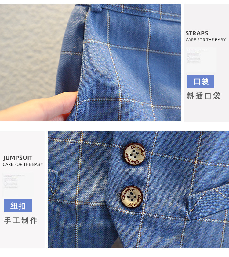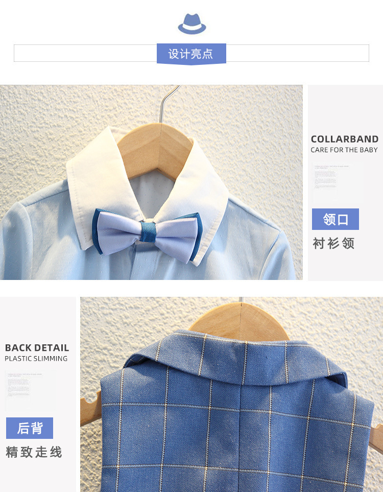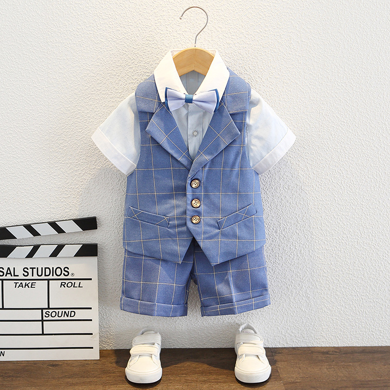 • 블루 체크 무늬 조끼 + 블루 체크 무늬 반바지 나비 넥타이