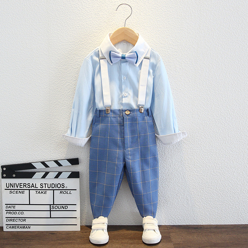• 블루 스타 도트 긴 소매 + 블루 체크 무늬 바지 나비 넥타이 스트랩