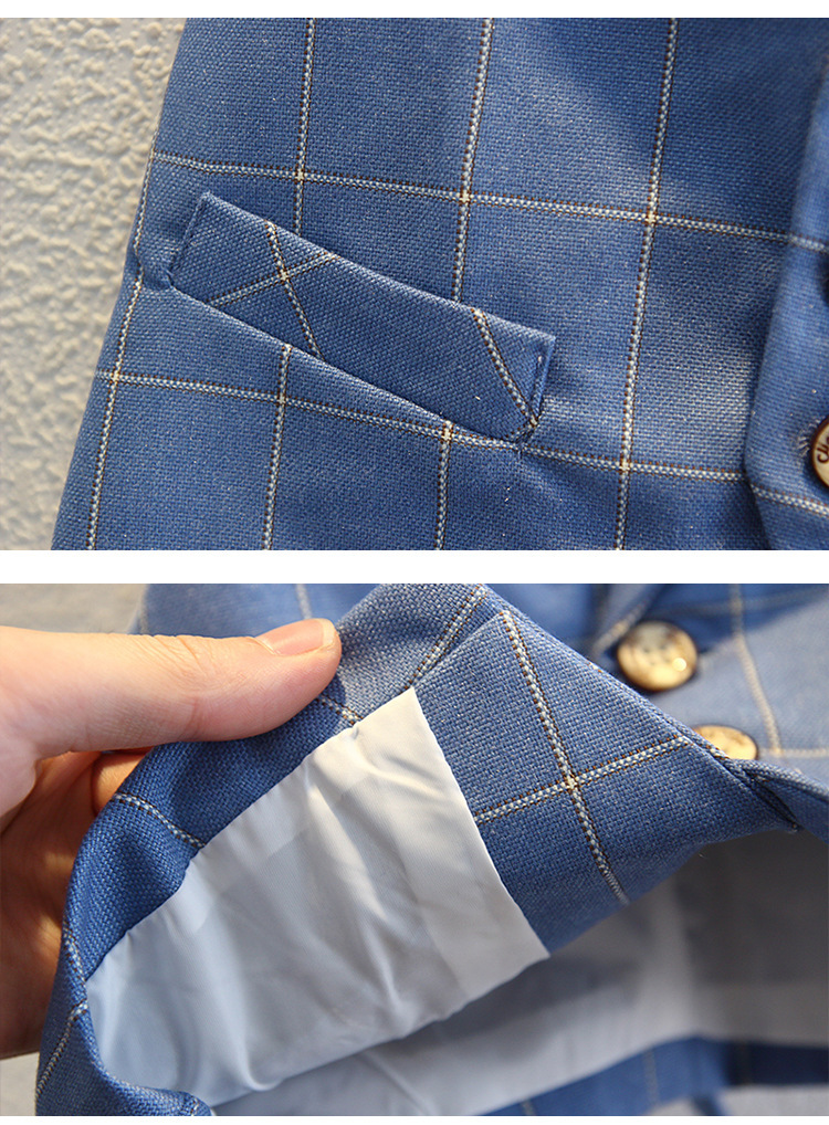 • 블루 체크 무늬 조끼 + 블루 체크 무늬 바지 나비 넥타이
