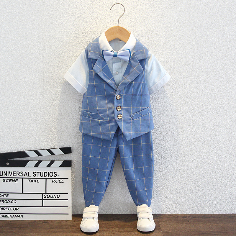 • 블루 체크 무늬 조끼 + 블루 체크 무늬 바지 + 블루 스타 도트 짧은 소매 나비 넥타이