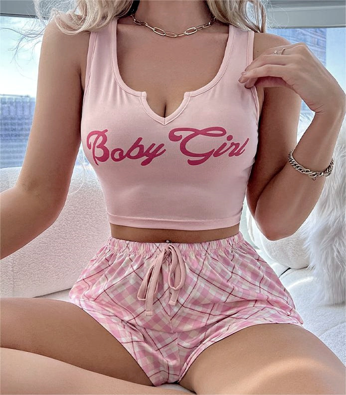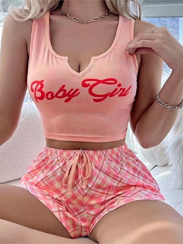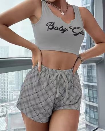 유럽과 미국의 여름 잠옷 여성 잠옷 투피스 섹시한 조끼 체크 무늬 반바지 홈웨어 크로스 보더 AliExpress