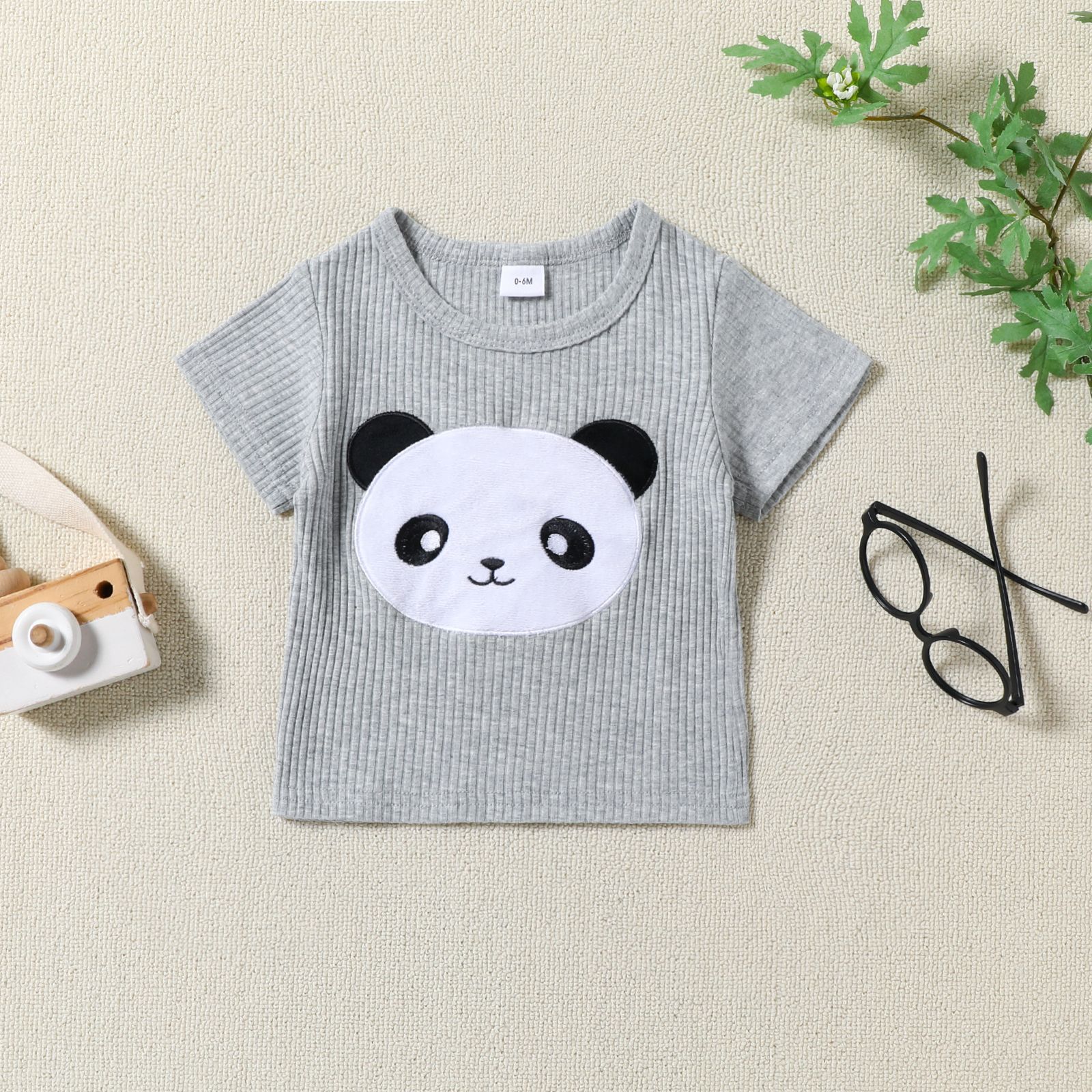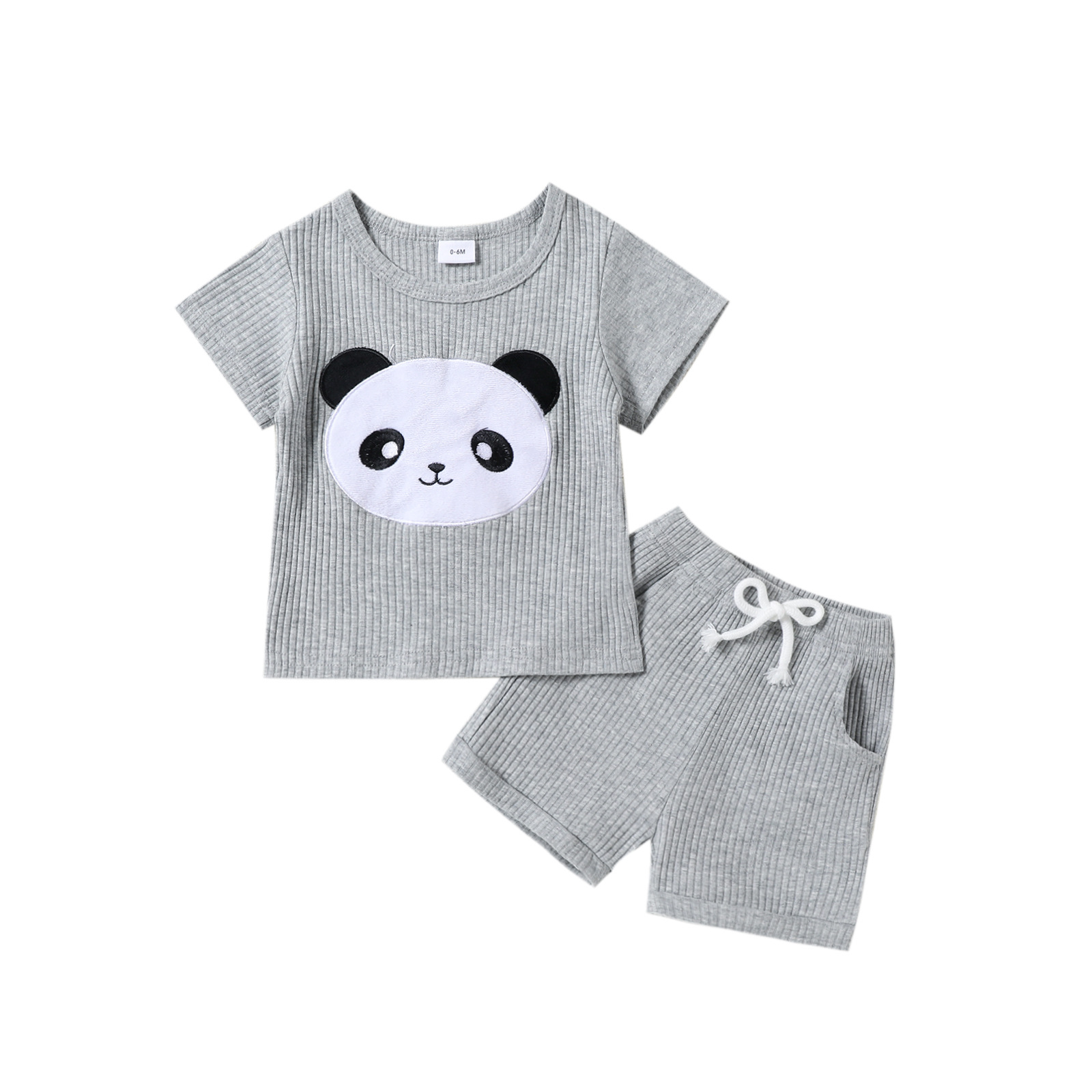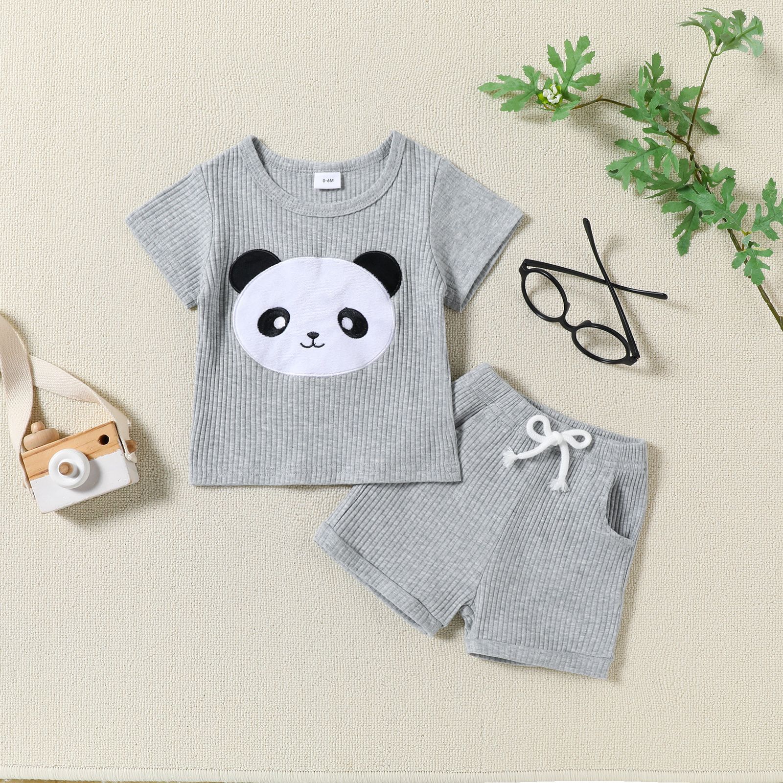 아마존 아동복 도매 소녀 팬더 패치 자수 티셔츠 + 단색 반바지 투피스 세트 여름 어린이 세트