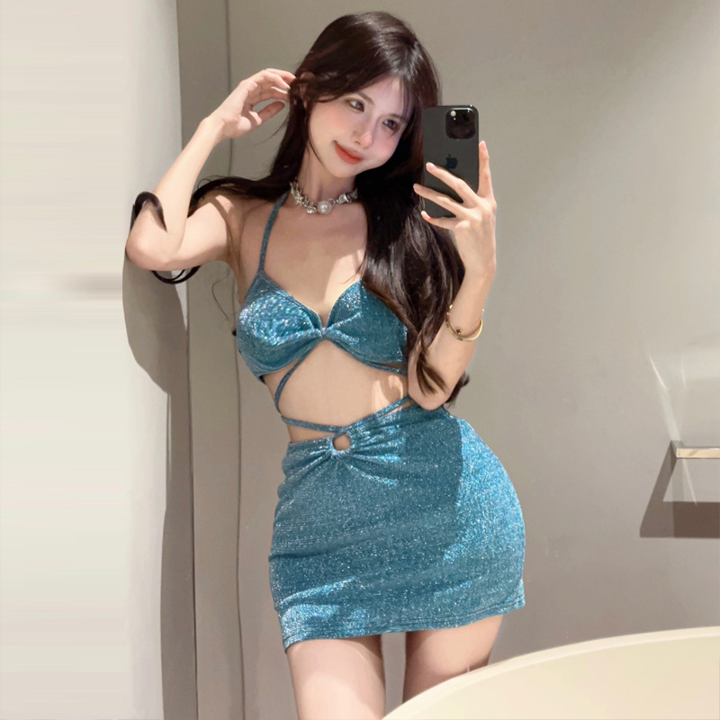 2175 유럽과 미국의 동남아시아 대외 무역 도매 2024 여성의 섹시한 반짝이는 고삐 슬링 슬링 슬링 짧은 치마 투피스 세트스토어 가기