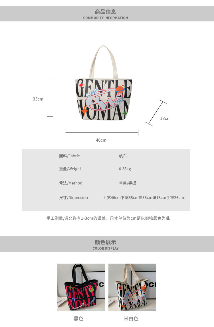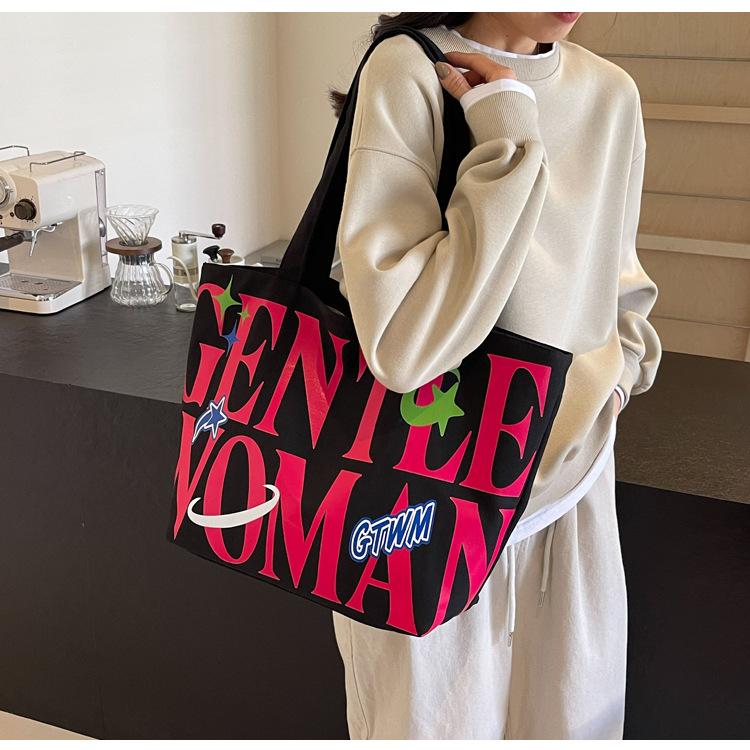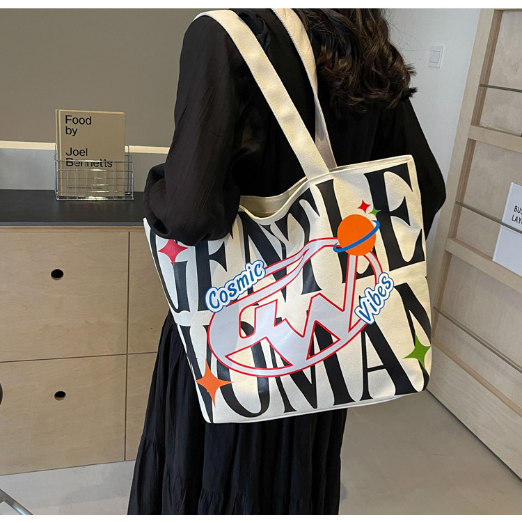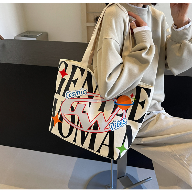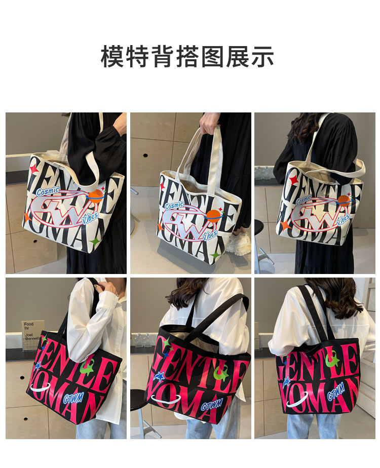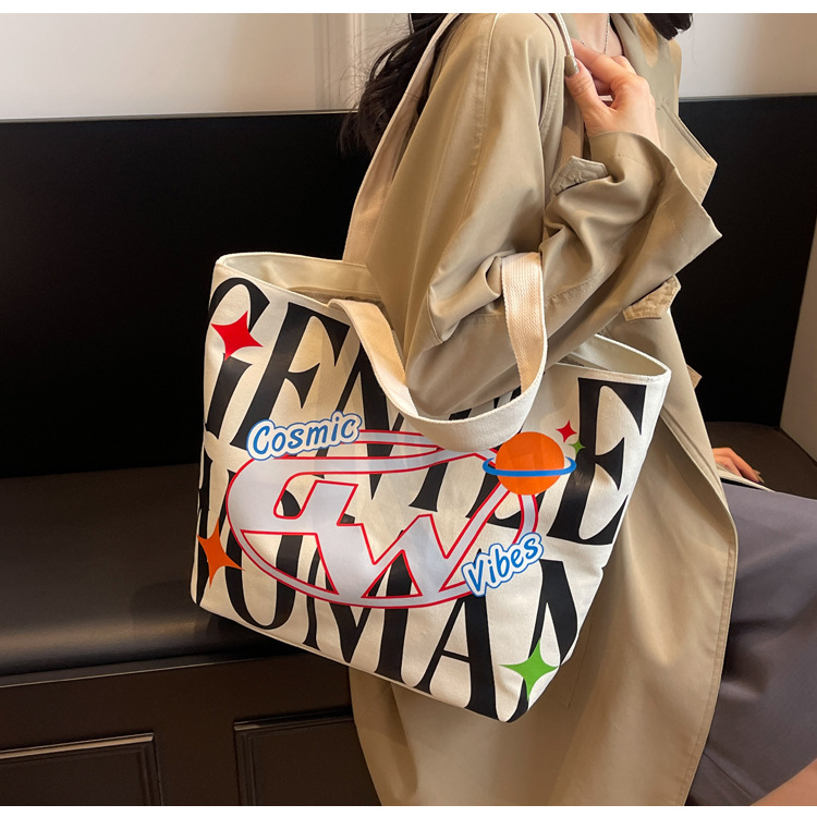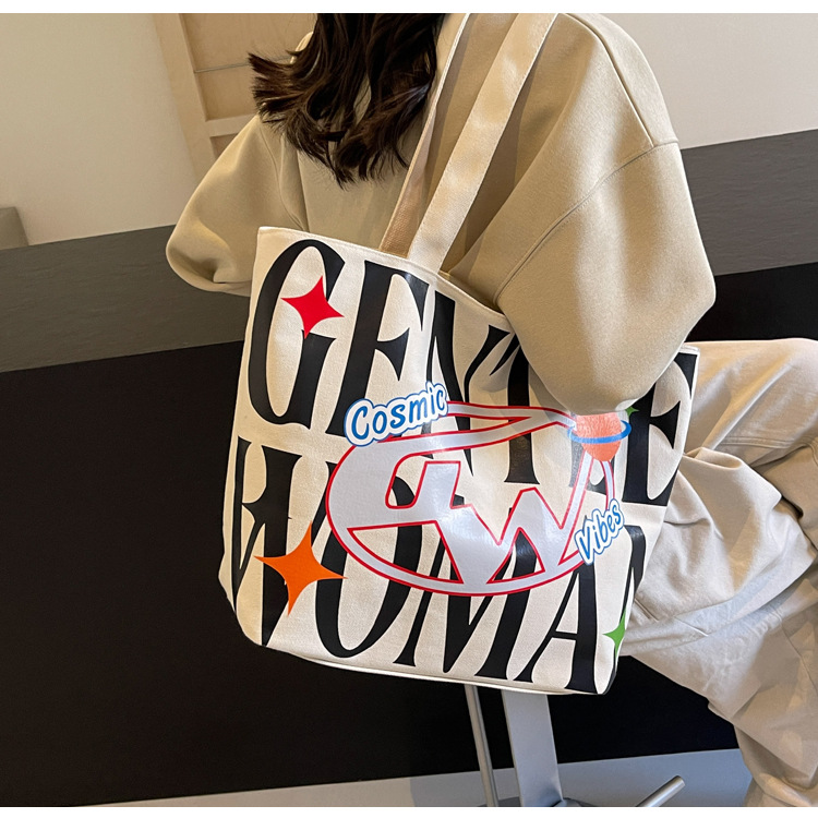 새로운 통근 캔버스 토트 백 2024 여성을위한 편지 대용량 가방 대학 학생 클래스 가방 겨드랑이 숄더백