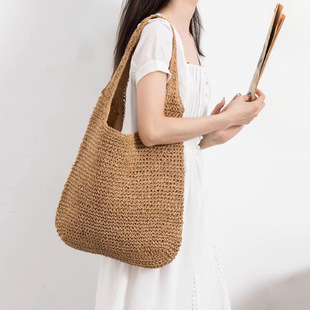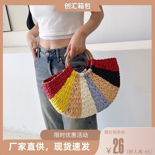 新款纸绳复古月亮包圆斗草编包 时尚简约手提编织包 草编包