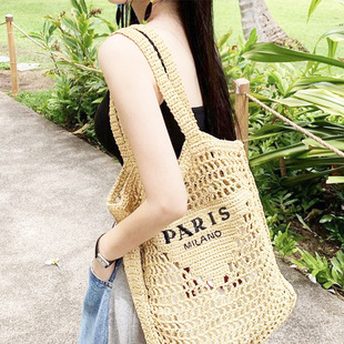 跨境热销草编包手工编织女手提包镂空时尚纯色刺绣字母草编单肩包