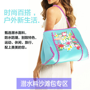 跨境专供潜水布沙滩包印花火烈鸟手提包户外野餐女士大容量手拎包