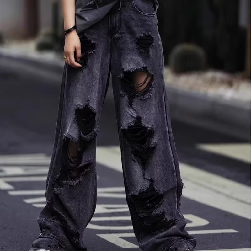 미국인은 고민 Pu 잘 생긴 와이드 레그 찢어진 청바지를 2024 새로운 패션 브랜드 스트리트 느슨한 스트레이트 바지에 남자를위한