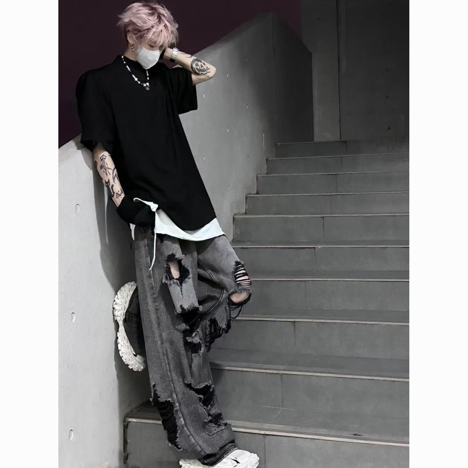 미국인은 고민 Pu 잘 생긴 와이드 레그 찢어진 청바지를 2024 새로운 패션 브랜드 스트리트 느슨한 스트레이트 바지에 남자를위한스토어 가기