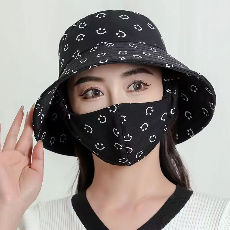 • 블랙 스마일리 페이스 [꽃무늬 마스크 일체형 모자]