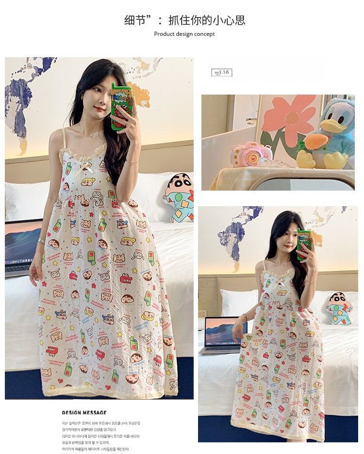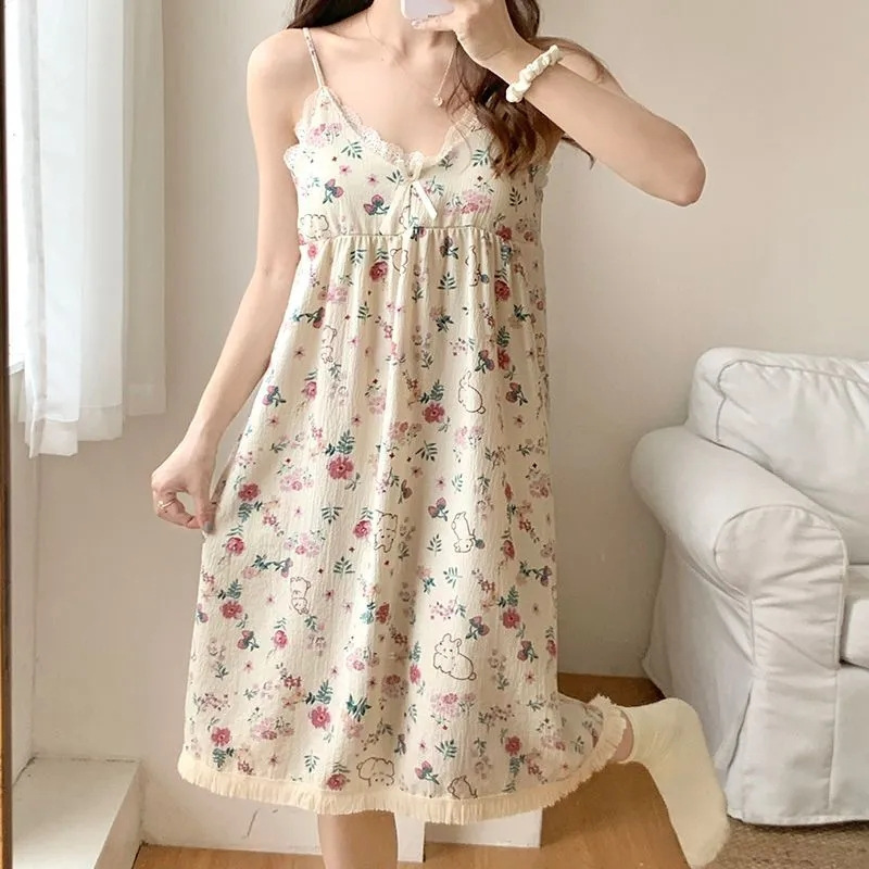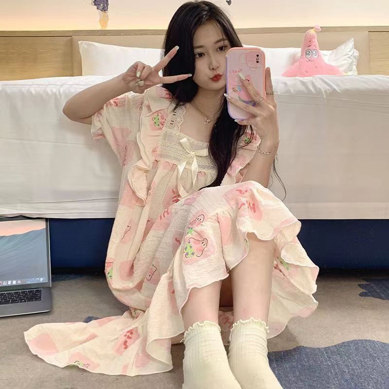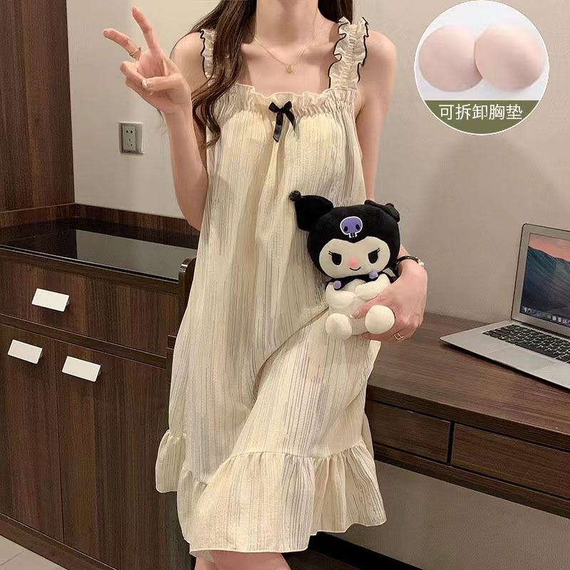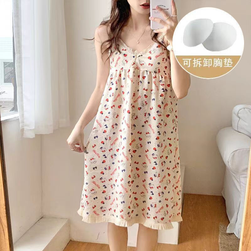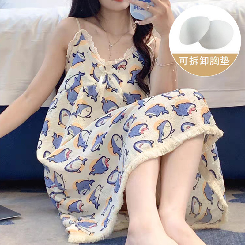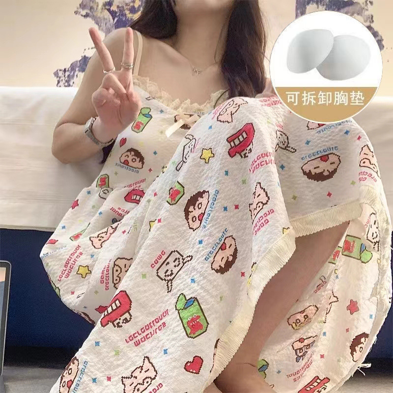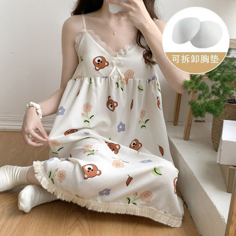 여성 슬립 온 나이트 드레스 가슴 패드 분리 가능한 버블 코튼 파자마 여성의 느슨한 달콤한 귀여운 홈웨어 여름 인기 스타일스토어 가기
