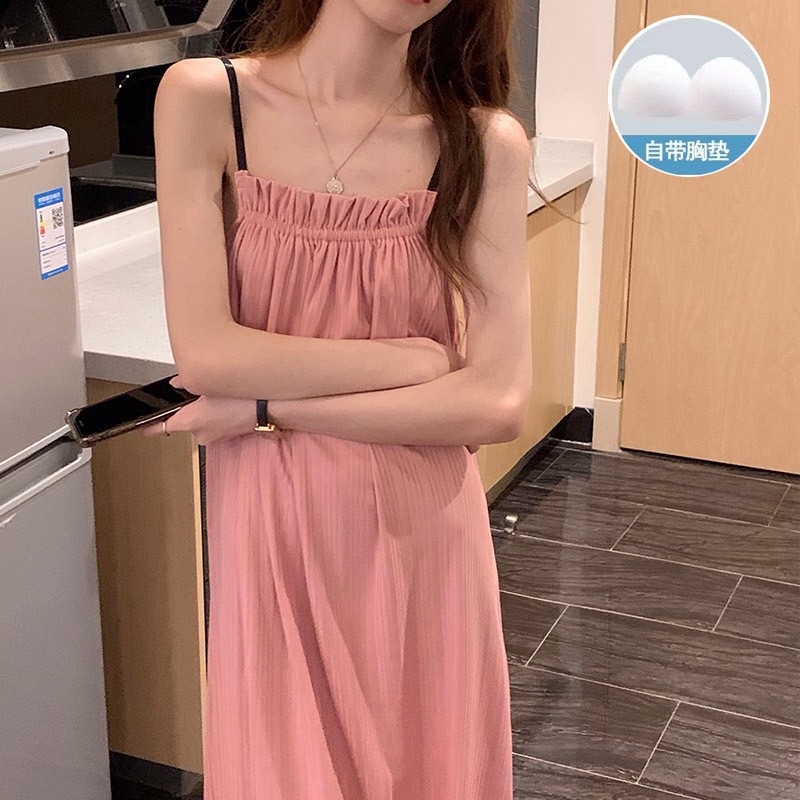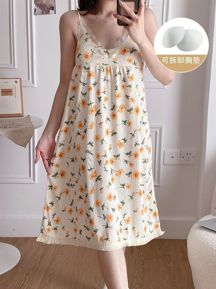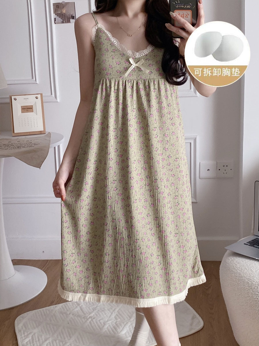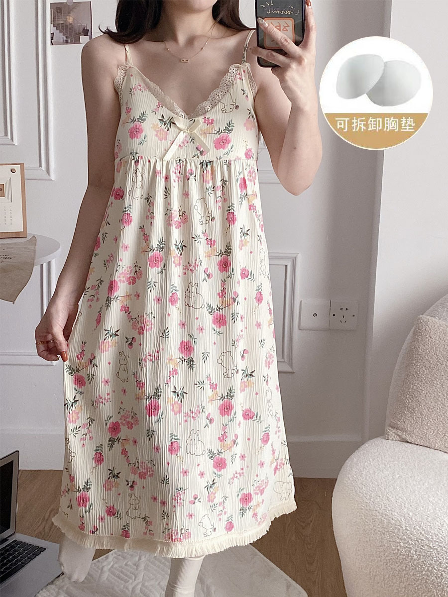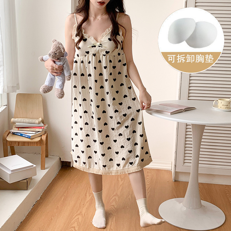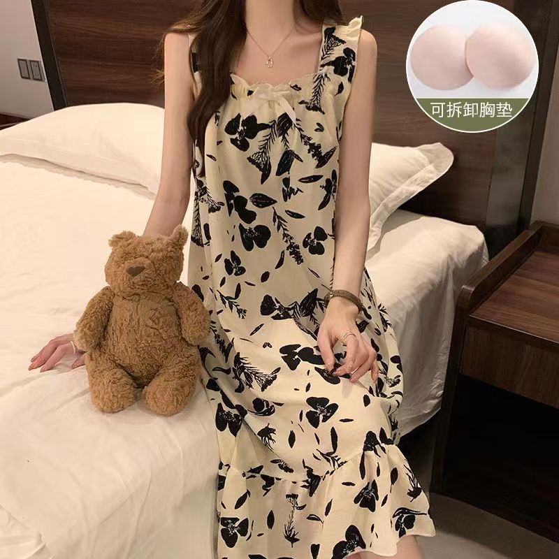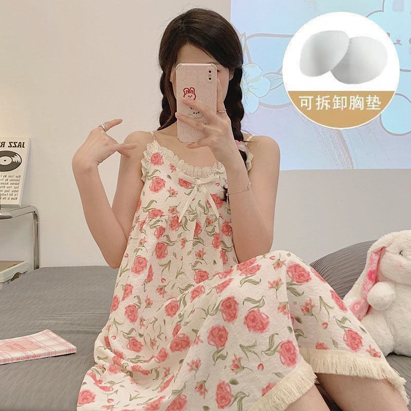 여성 슬립 온 나이트 드레스 가슴 패드 분리 가능한 버블 코튼 파자마 여성의 느슨한 달콤한 귀여운 홈웨어 여름 인기 스타일