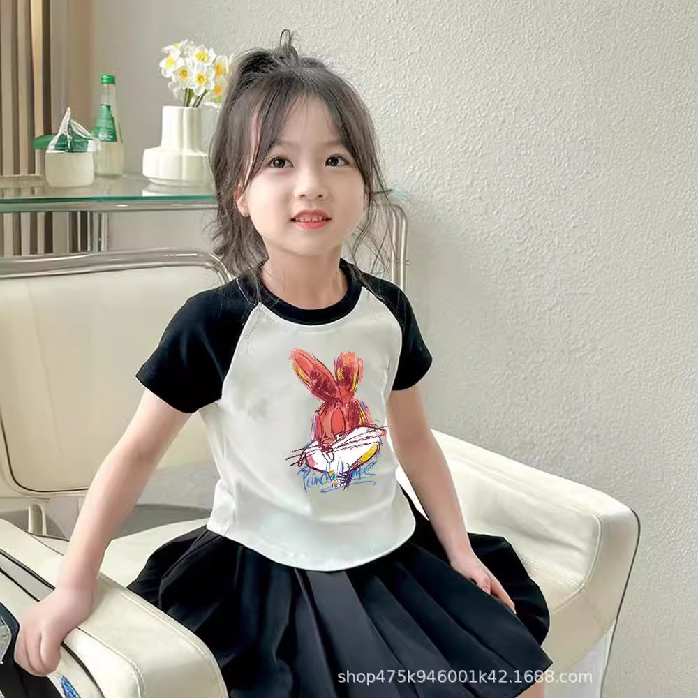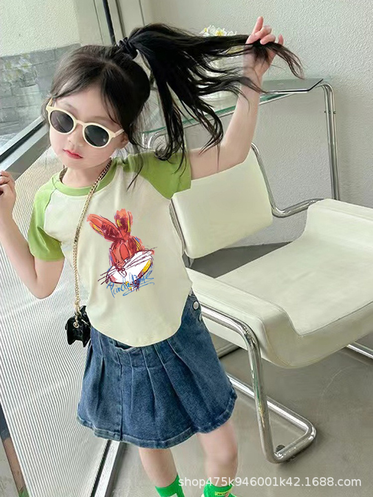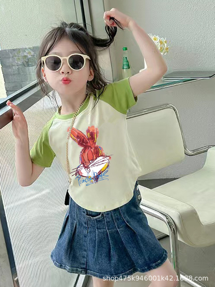 크로스 보더 소녀면 컬러 매칭 반팔 티셔츠 슬림 핏 어린이 여름복 2024 새 소녀들의 세련된 쇼트 탑스토어 가기