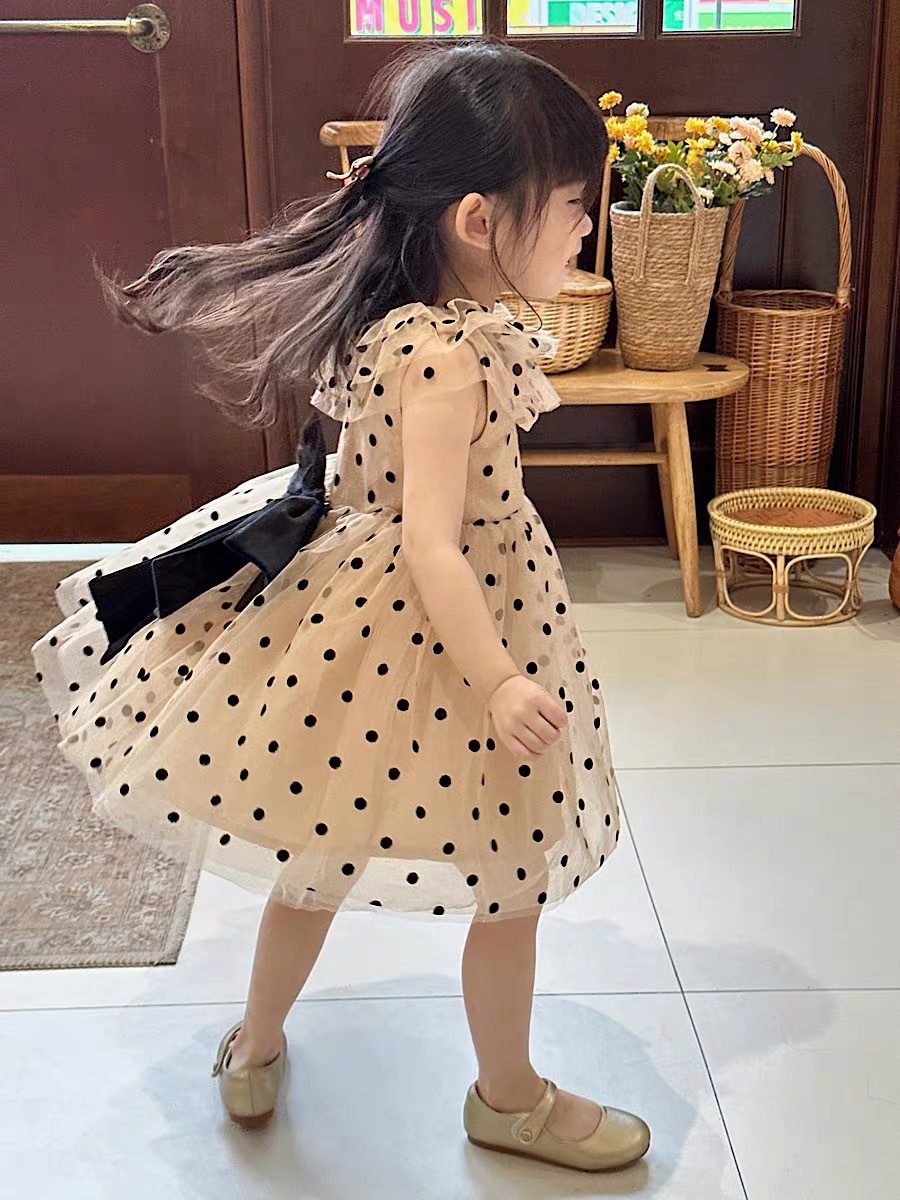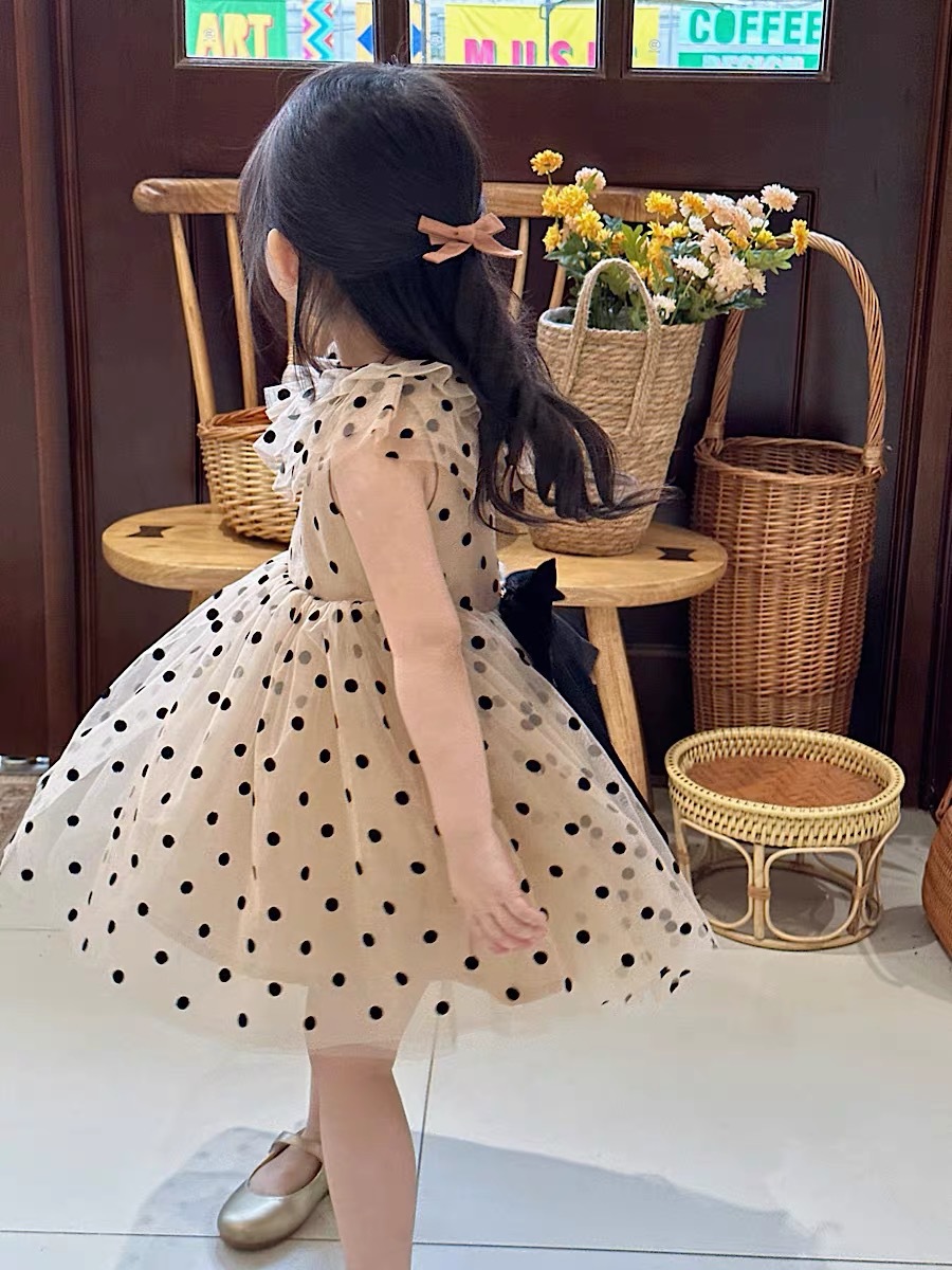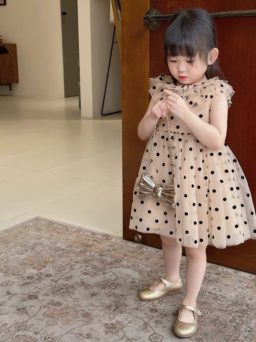 재고 소녀 24 여름 새로운 원피스 폴카 도트 메쉬 스커트 아기 공주 원피스 프릴 칼라 활 거즈 스커트