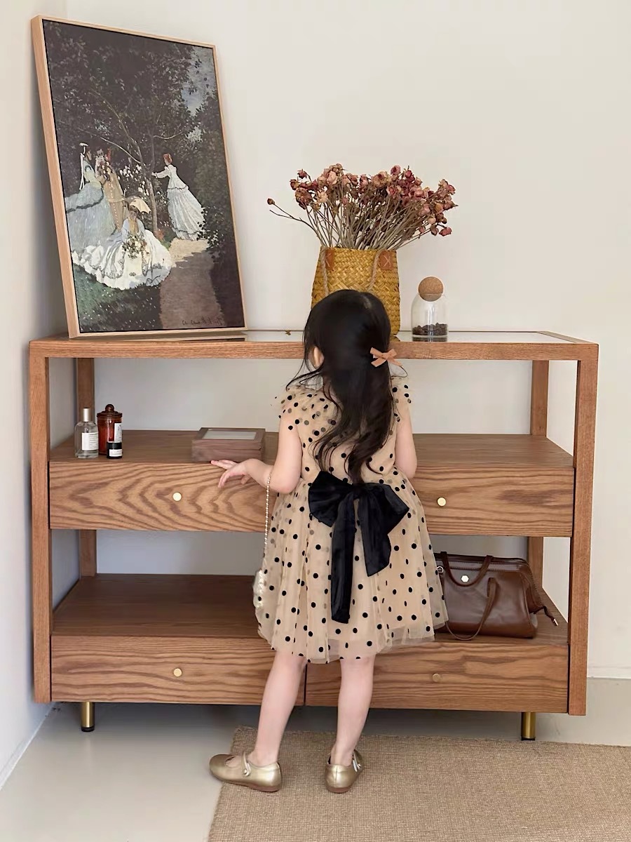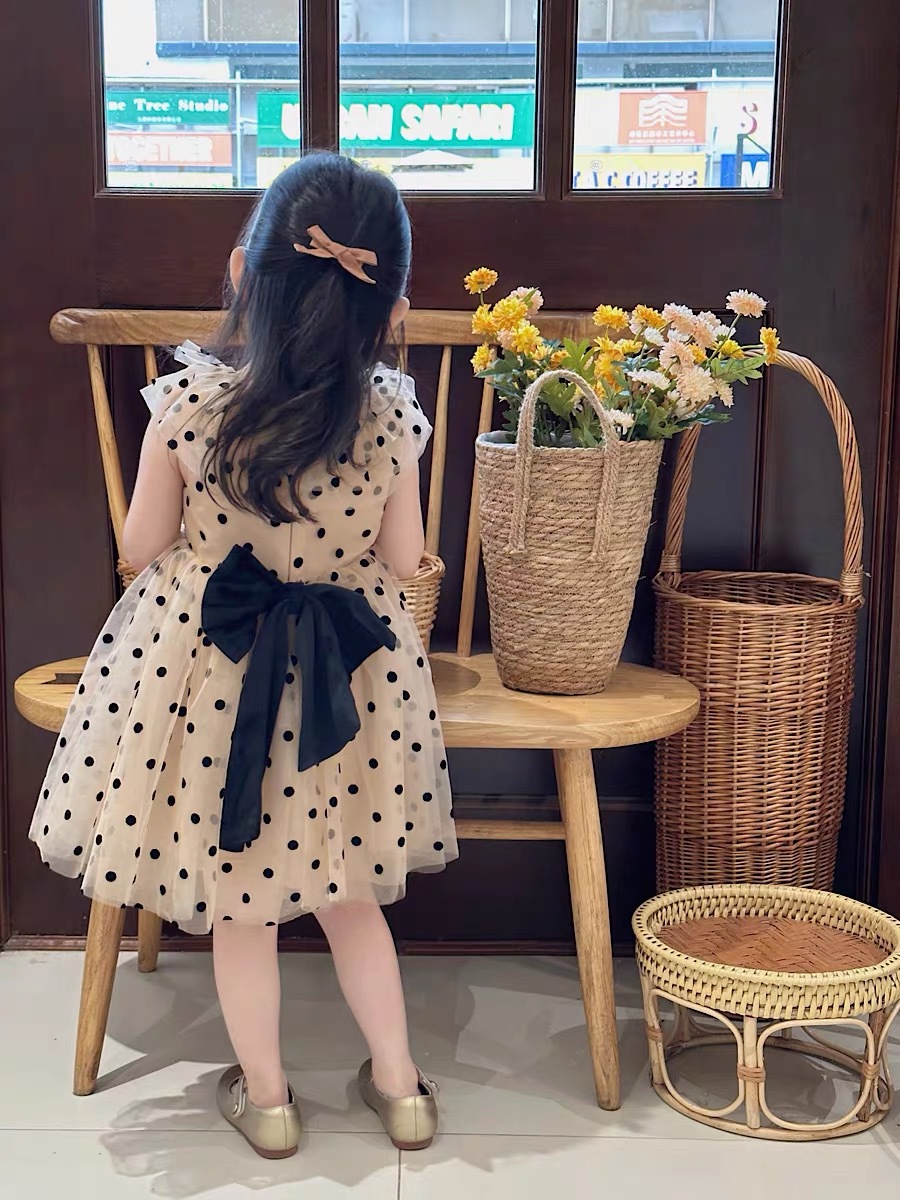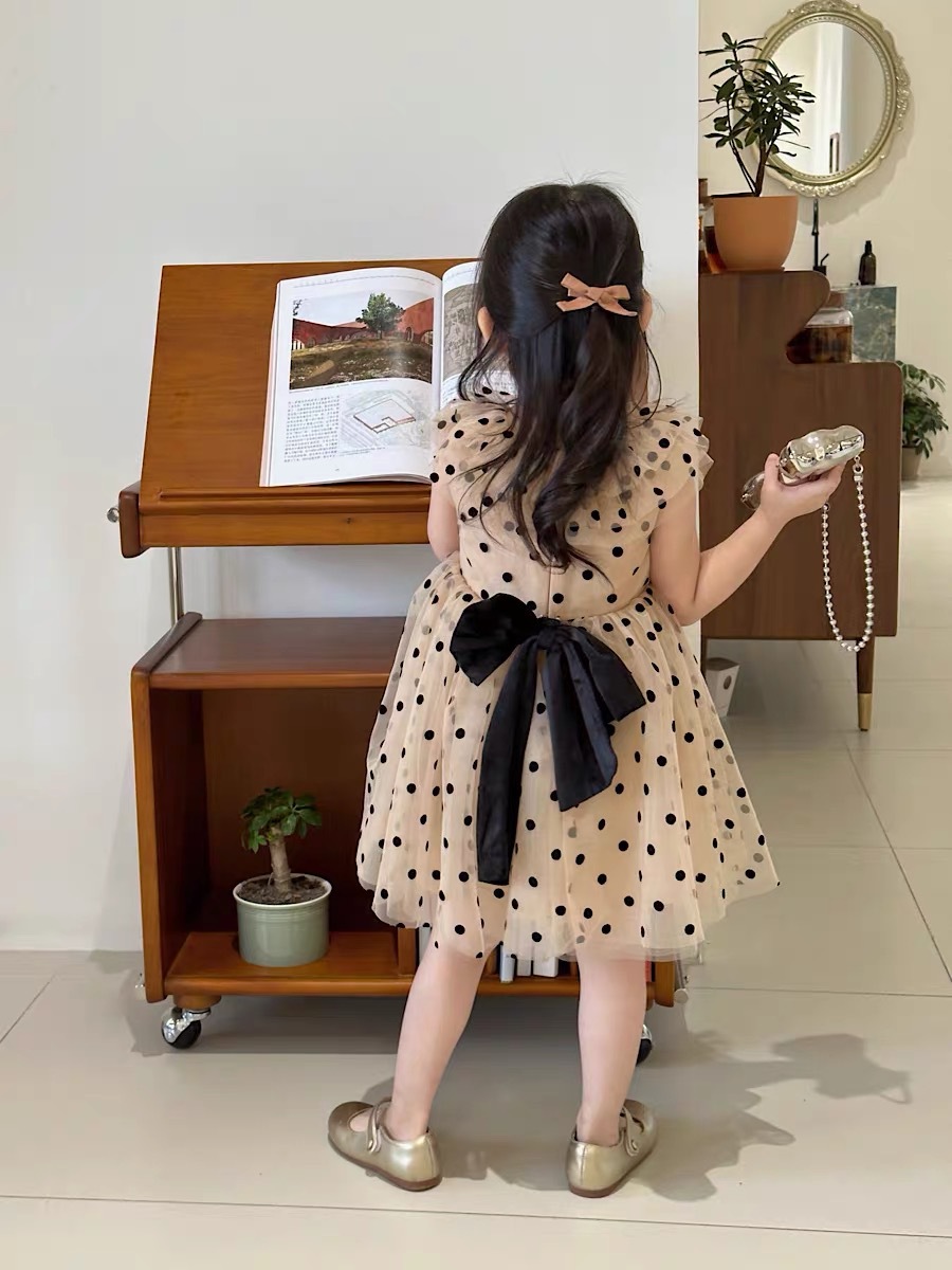 재고 소녀 24 여름 새로운 원피스 폴카 도트 메쉬 스커트 아기 공주 원피스 프릴 칼라 활 거즈 스커트