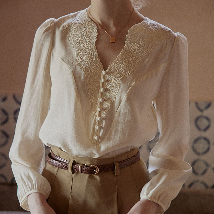 프랑스 복고풍 중공업 자수 v 넥 셔츠 여성 의류 봄 2025 새로운 긴팔 패션 기질 탑 다목적