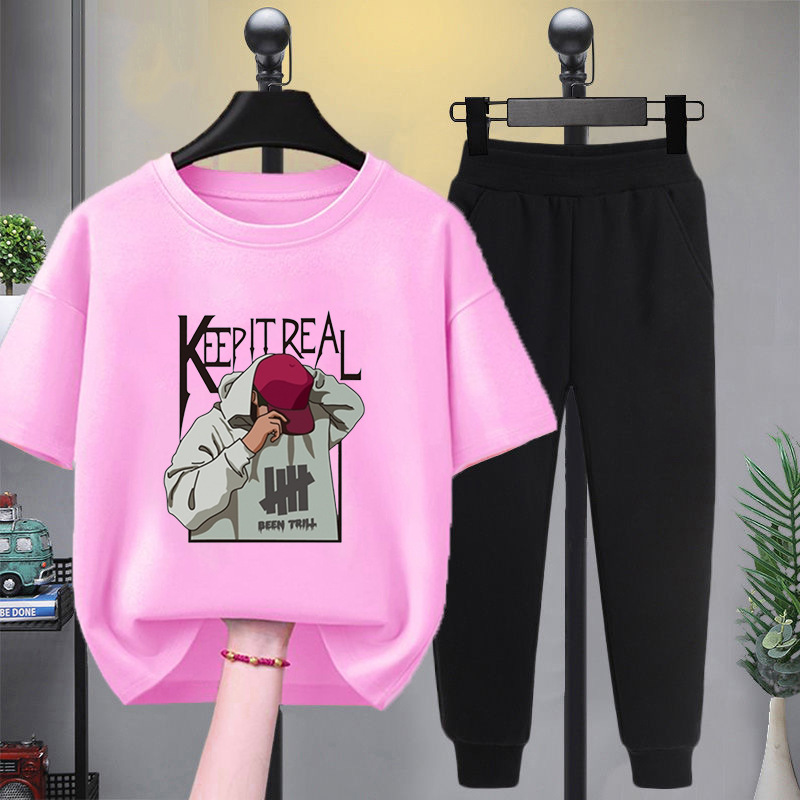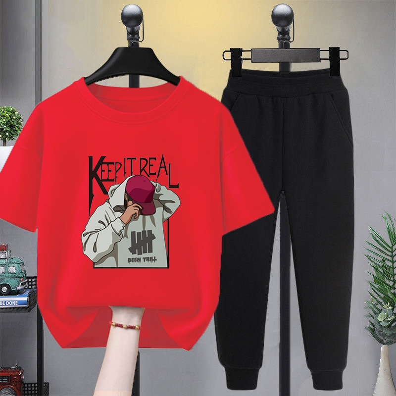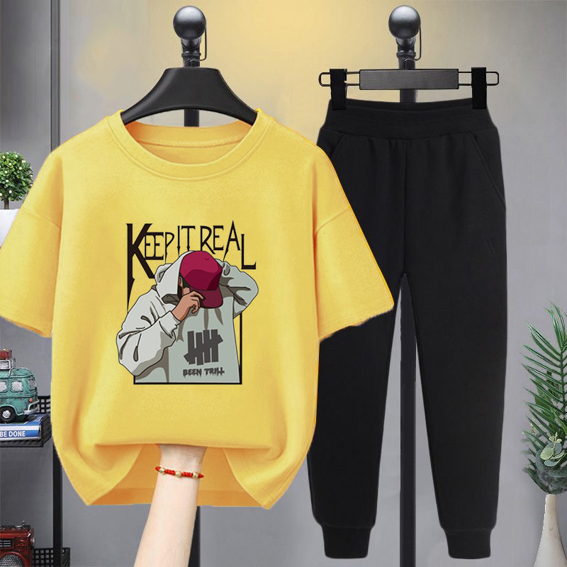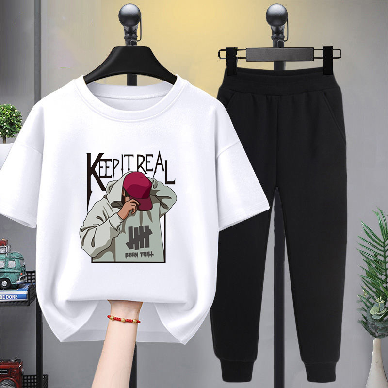 소년 소녀를위한 여름 2024 코튼 만화 캐릭터 티셔츠 새로운 트렌디 한 반팔 바지 투피스 세트