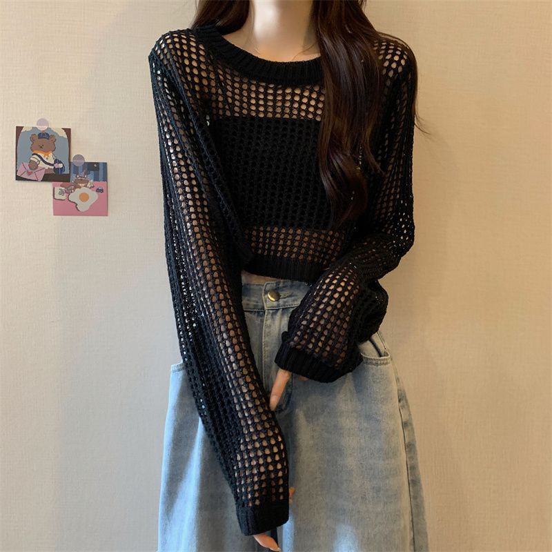 여성의 속이 빈 스웨터 2023 새로운 여름 얇은 느슨한 서양식 짧은 태양 보호 외부 블라우스 핫 걸 탑