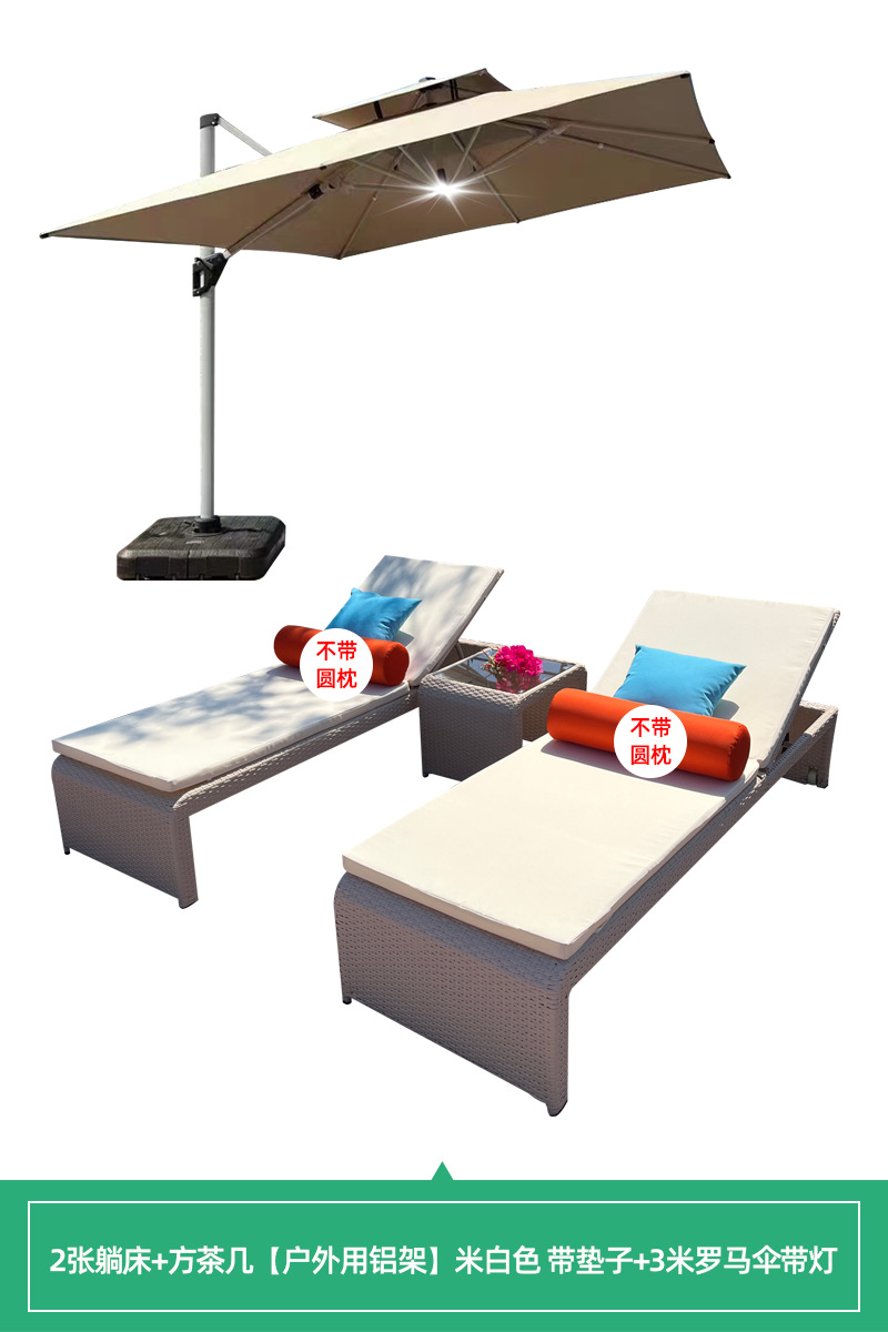 • [야외 알루미늄 프레임] 2 개의 누워있는 침대 + 사각형 티 테이블 베이지 매트 + 3 m 로마 우산 빛