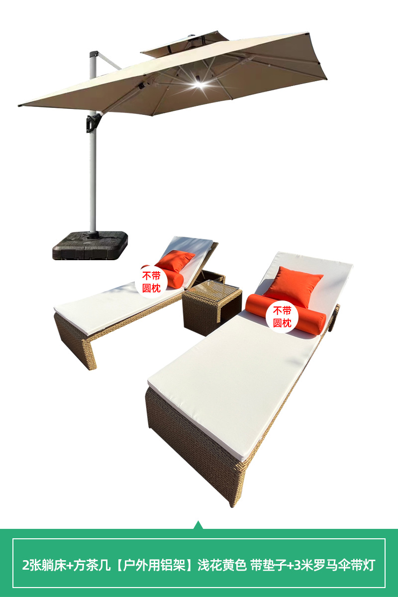 • [야외 알루미늄 프레임] 2 개의 누워있는 침대 + 사각형 티 테이블 밝은 꽃 노란색 매트 + 3 m 빛 로마 우산