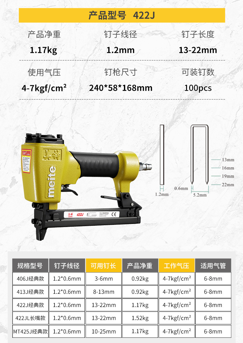Meite 공압 네일건 코드 네일건 422J 네일건 코드 네일건 목공 1022 특수 가정용 코드 네일건 1013