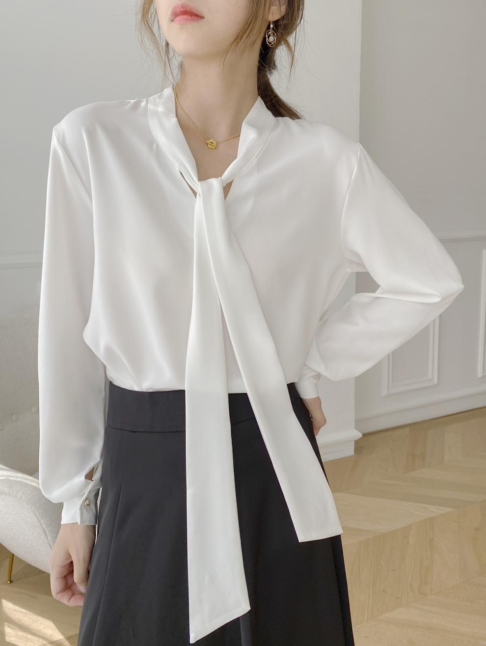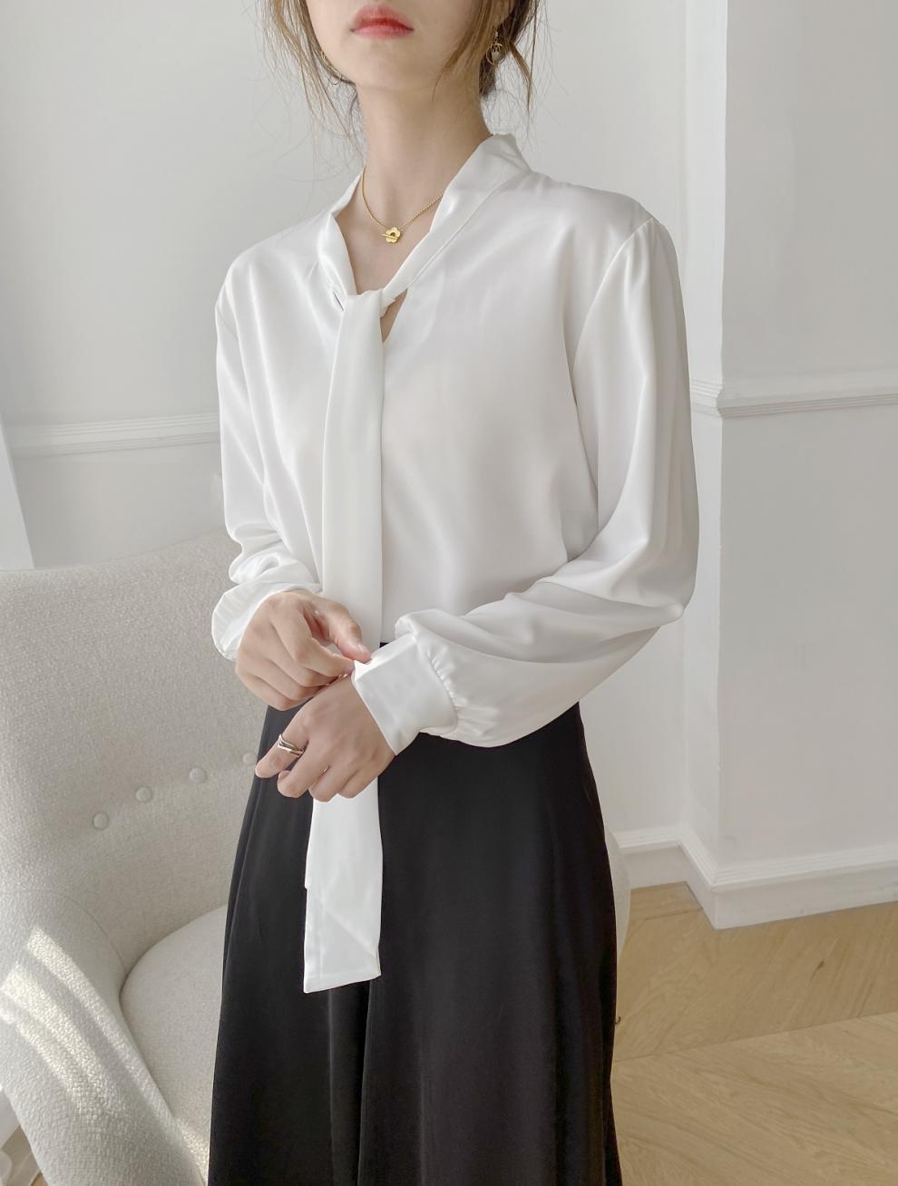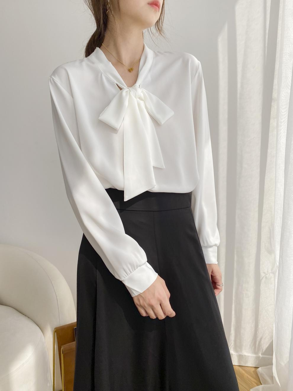 봄과 가을 나비 레이스 업 화이트 쉬폰 셔츠 여성의 전문 기질 긴팔 셔츠 2024 실제 샷스토어 가기