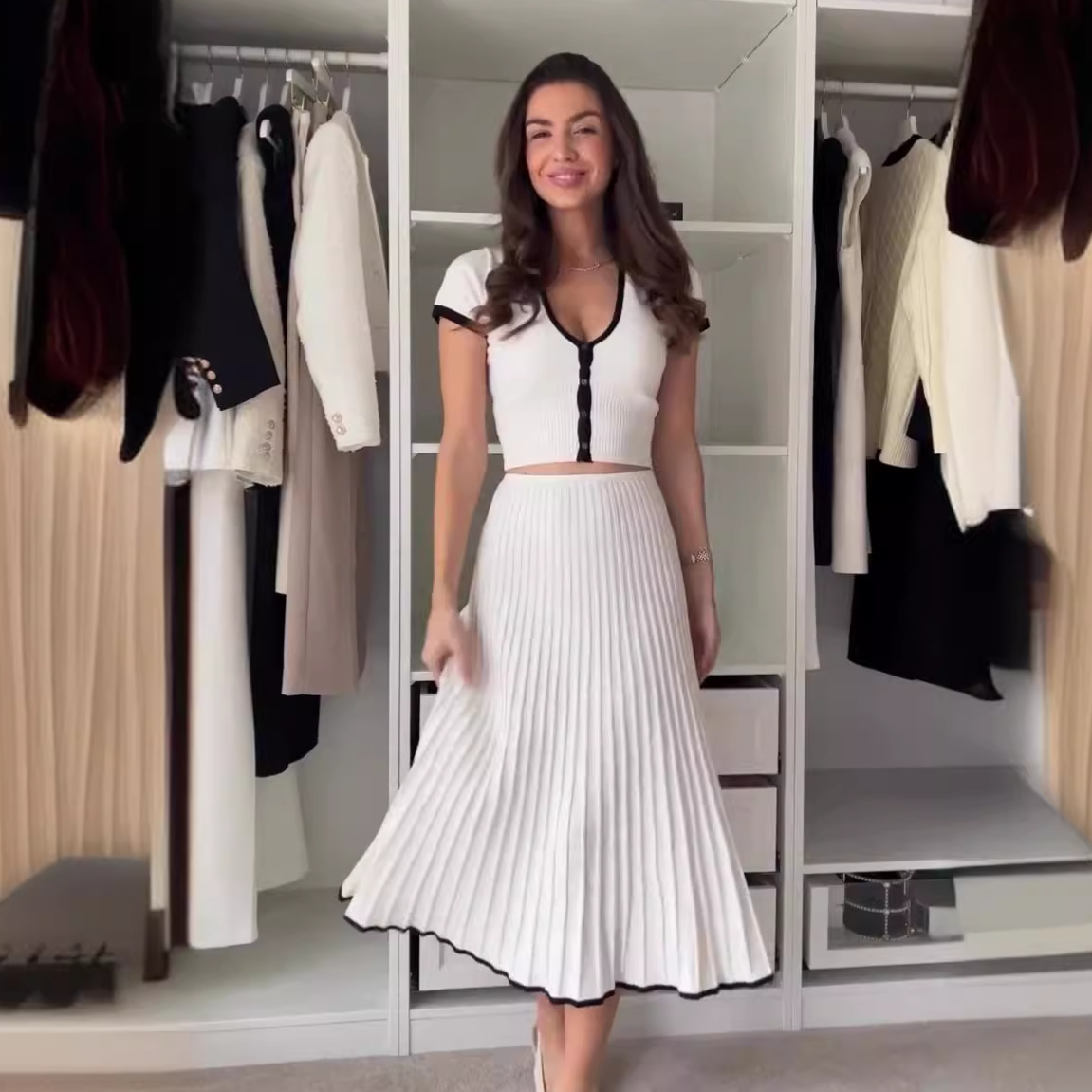 2024 여름 새로운 유럽과 미국의 아마존 국경 대비 컬러 U-넥 스트레치 슬림 짧은 최고 치마 세트 여성스토어 가기