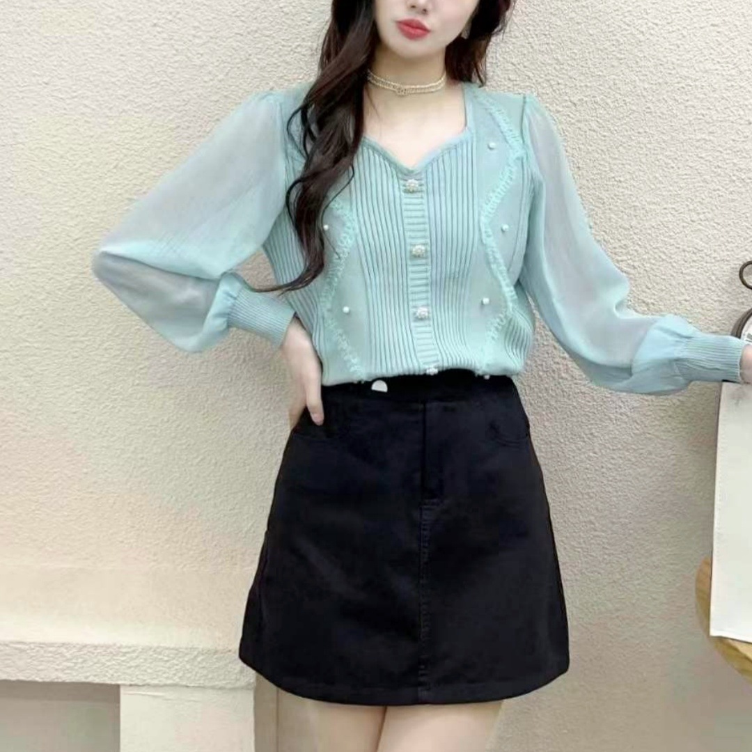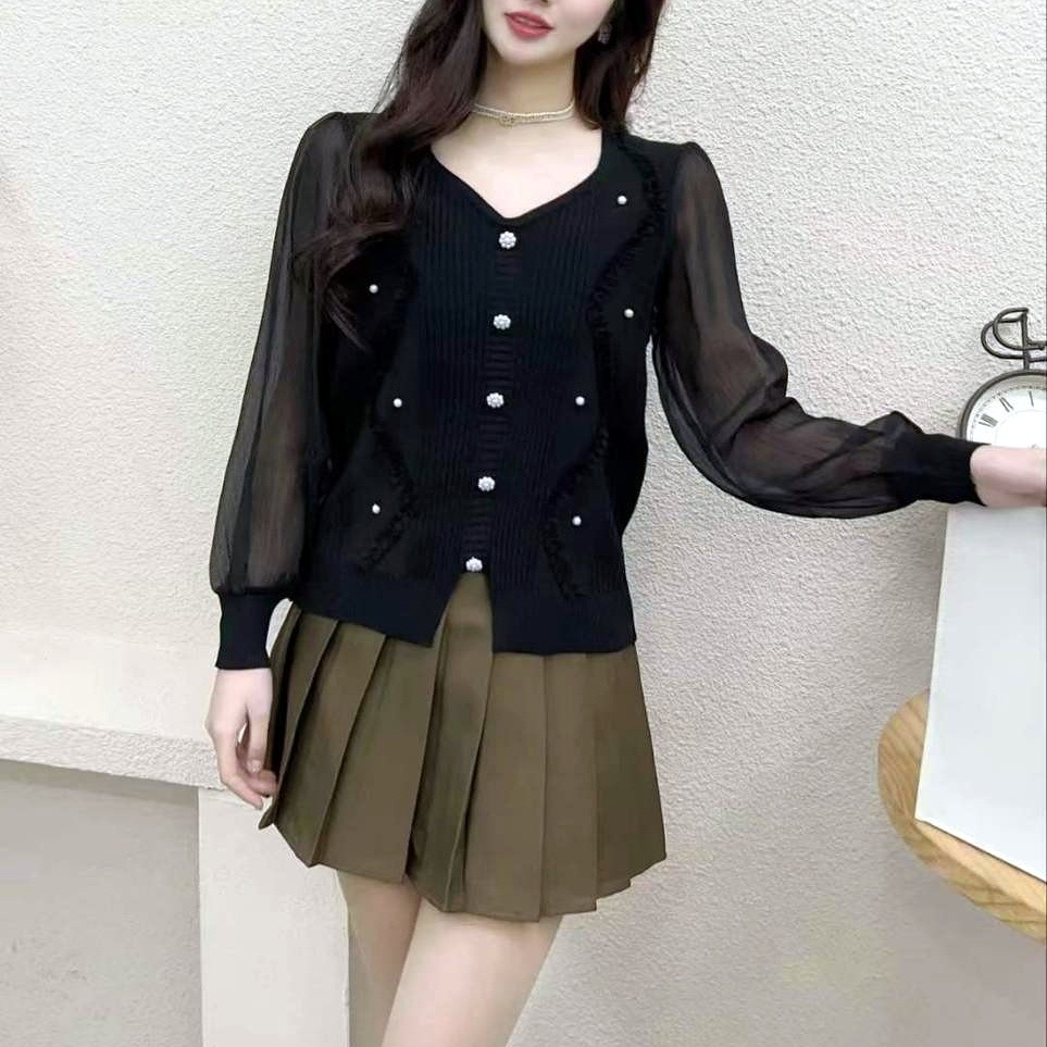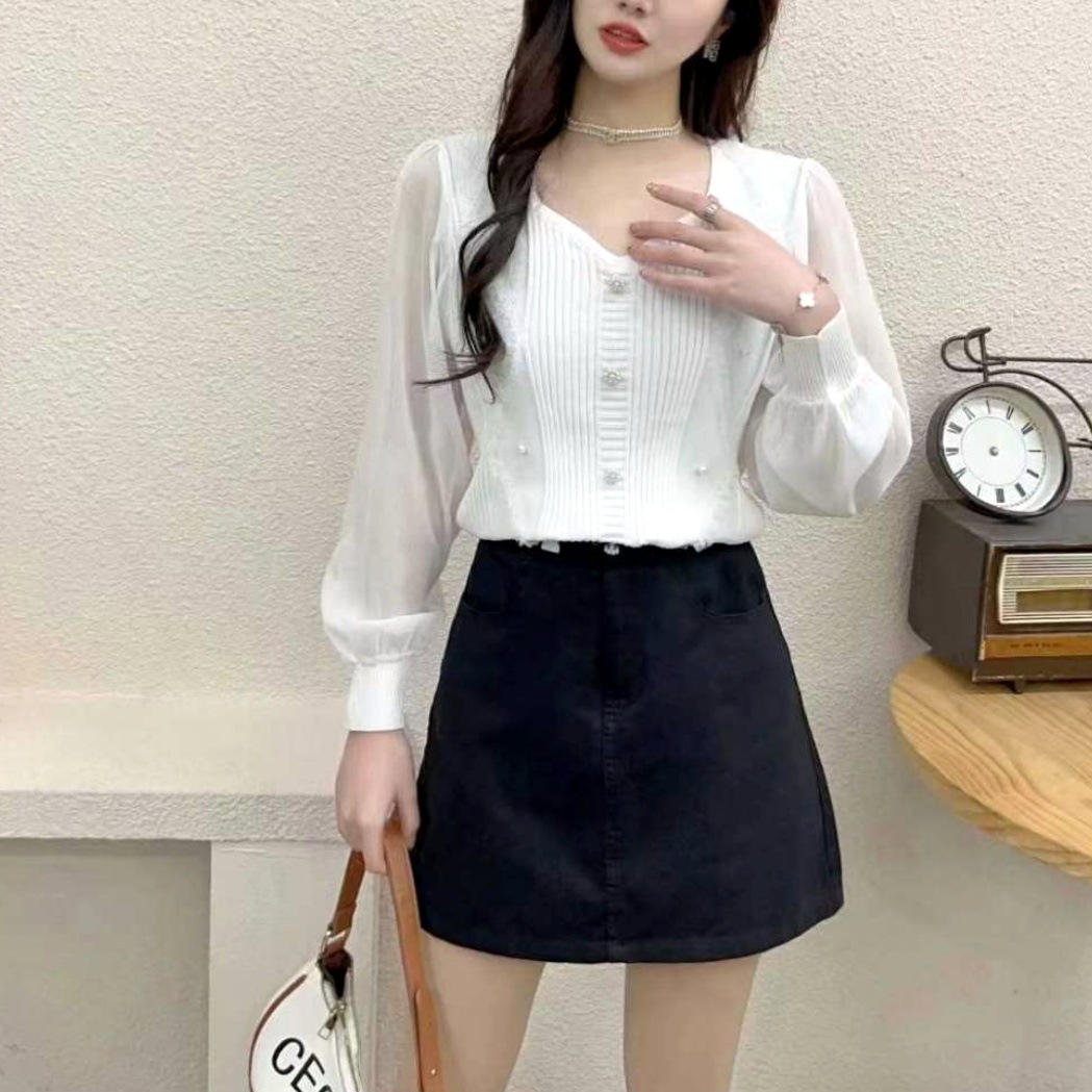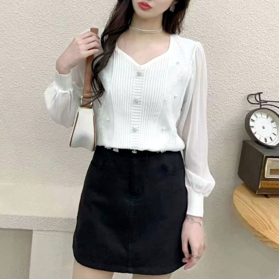 2024 봄과 여름 스티칭 슬리밍 새로운 샤넬 스타일 긴 소매 스티칭 쉬폰 프랑스 스타일 스웨터 배꼽 커버 탑스토어 가기